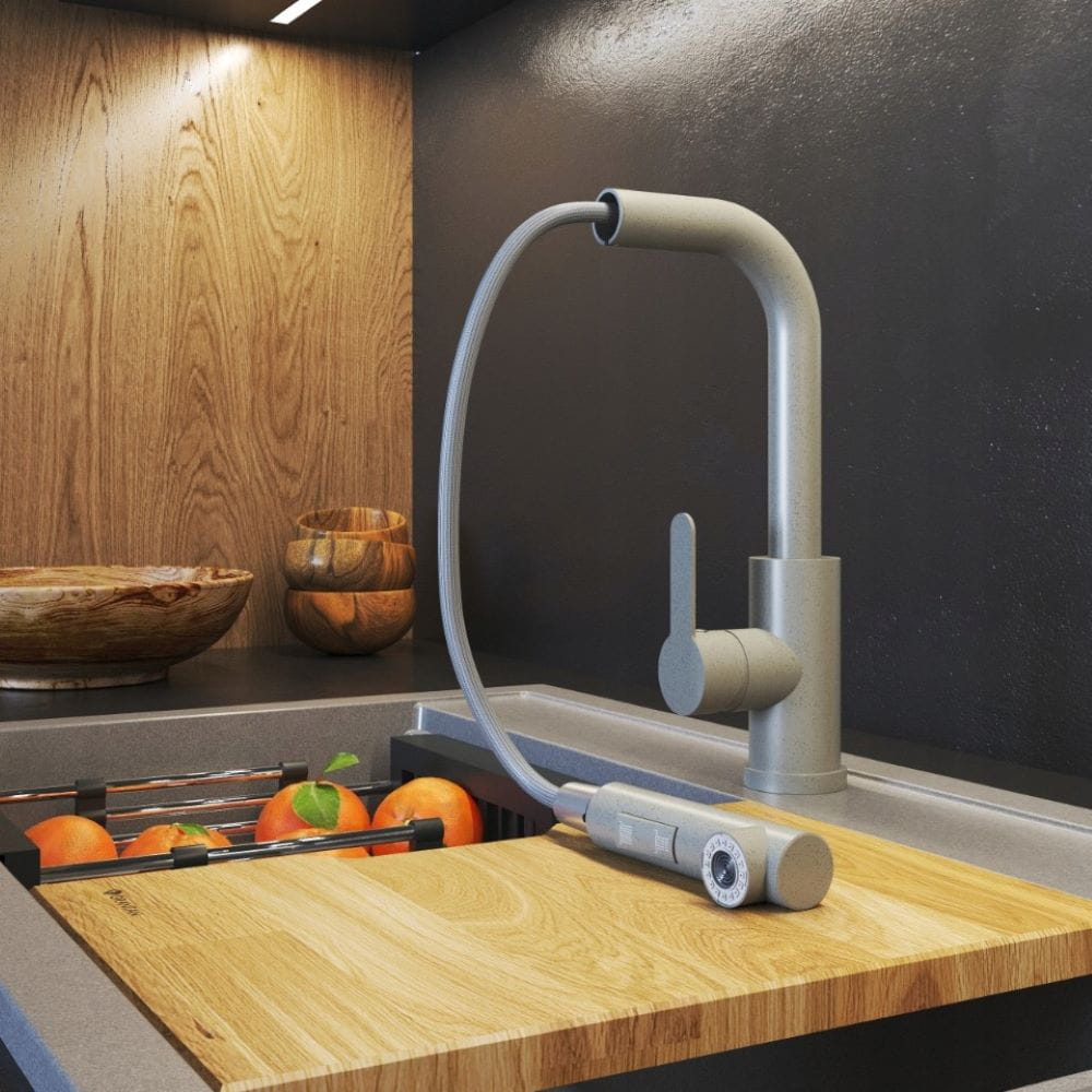 Ebra beżowa, to rodzaj baterii zlewozmywakowej wyposażonej w specyficzną wylewkę 360`, którą można wyciągnąć z uchwytu i używać jak prysznica. Pozwala to na bezproblemowe skierowanie strumienia wody w różne kierunki i miejsca, co jest szczególnie istotne i przydatne w kuchni. Słuchawka baterii posiada funkcję dwóch trybów strumienia wody (natryskowy i standardowy), co potęguje wszechstronność modelu i przekłada się na wygodę podczas użytkowania. Konstrukcja wykonana z mosiądzu.