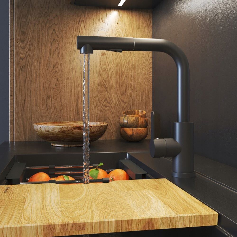 Ebra czarna, to rodzaj baterii zlewozmywakowej wyposażonej w specyficzną wylewkę 360`, którą można wyciągnąć z uchwytu i używać jak prysznica. Pozwala to na bezproblemowe skierowanie strumienia wody w różne kierunki i miejsca, co jest szczególnie istotne i przydatne w kuchni. Słuchawka baterii posiada funkcję dwóch trybów strumienia wody (natryskowy i standardowy), co potęguje wszechstronność modelu i przekłada się na wygodę podczas użytkowania. Konstrukcja wykonana z mosiądzu.