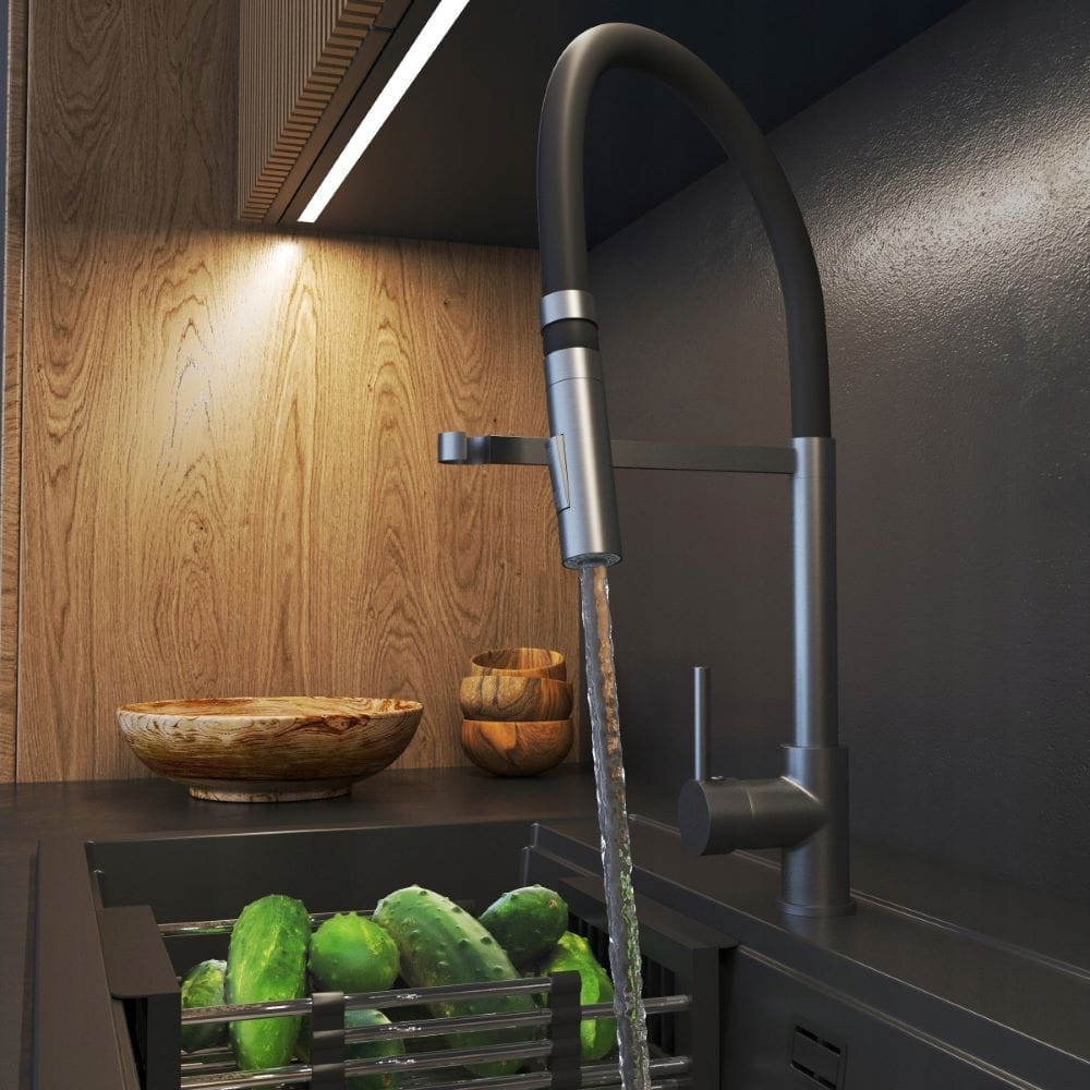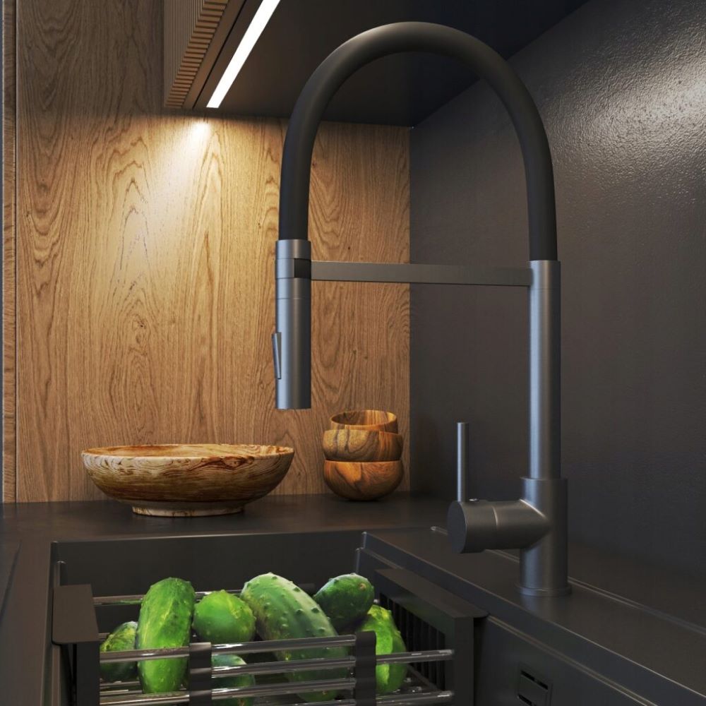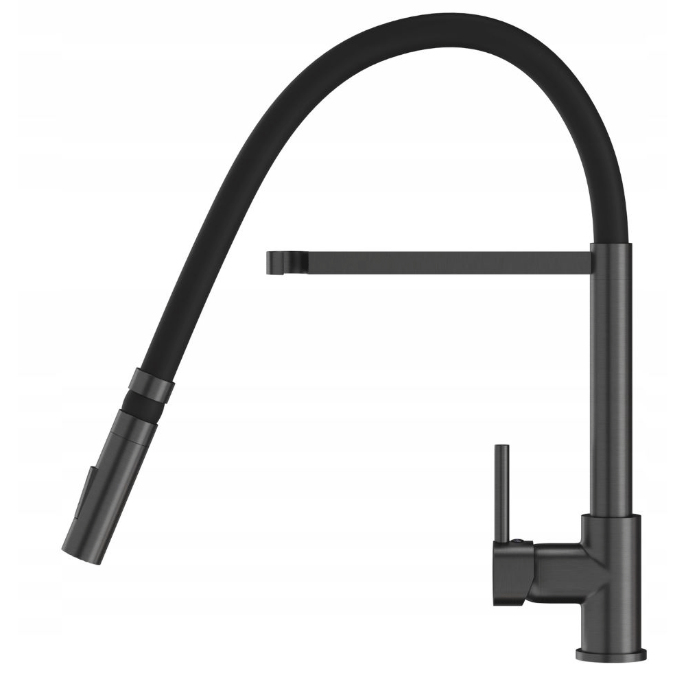 Kran kuchenny w kolorze gun grey, z elastyczną, wyciąganą wylewką to innowacyjny rodzaj baterii, który oferuje większą wygodę podczas korzystania z wody w kuchni. Dzięki możliwości uginania wylewki w różnych kierunkach, można łatwo dotrzeć do trudno dostępnych miejsc w zlewie, naczyniach, a nawet dużych garnkach i patelniach. Dodatkowym atutem modelu Vento jest dwufunkcyjna słuchawka, która w zależności od potrzeb, może emitować klasyczny lub natryskowy strumień wody.