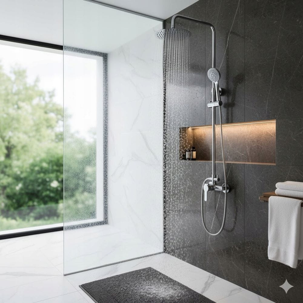Bateria prysznicowa NAVA Chrom to nowoczesne i funkcjonalne rozwiązanie stworzone z myślą o komforcie codziennej kąpieli. Doskonale sprawdzi się zarówno w kabinie prysznicowej, jak i przy wannie z parawanem. Połączenie trwałości stali nierdzewnej i mosiądzu gwarantuje odporność na wilgoć, korozję i uszkodzenia mechaniczne, a eleganckie chromowane wykończenie podkreśla nowoczesny charakter łazienki.