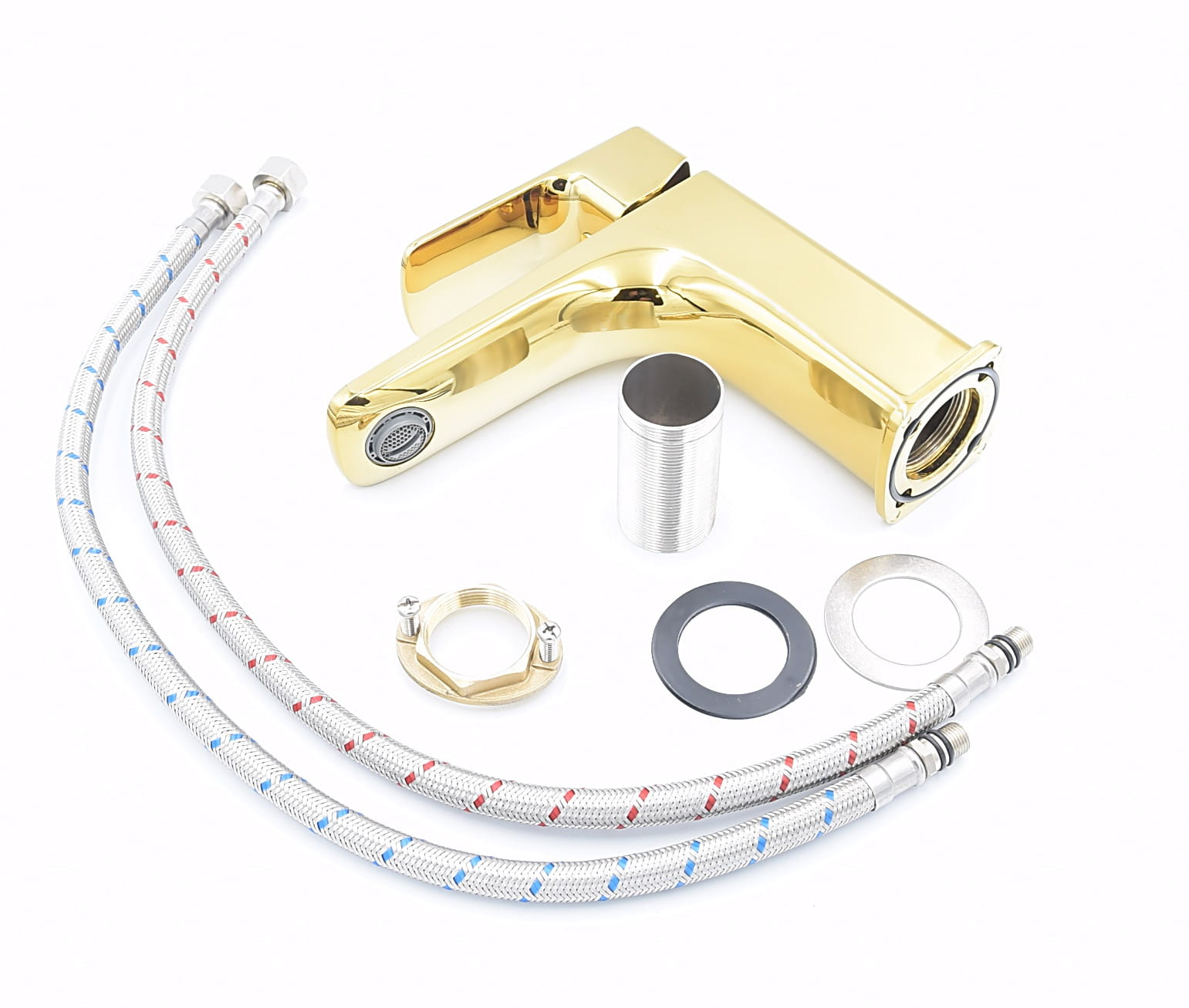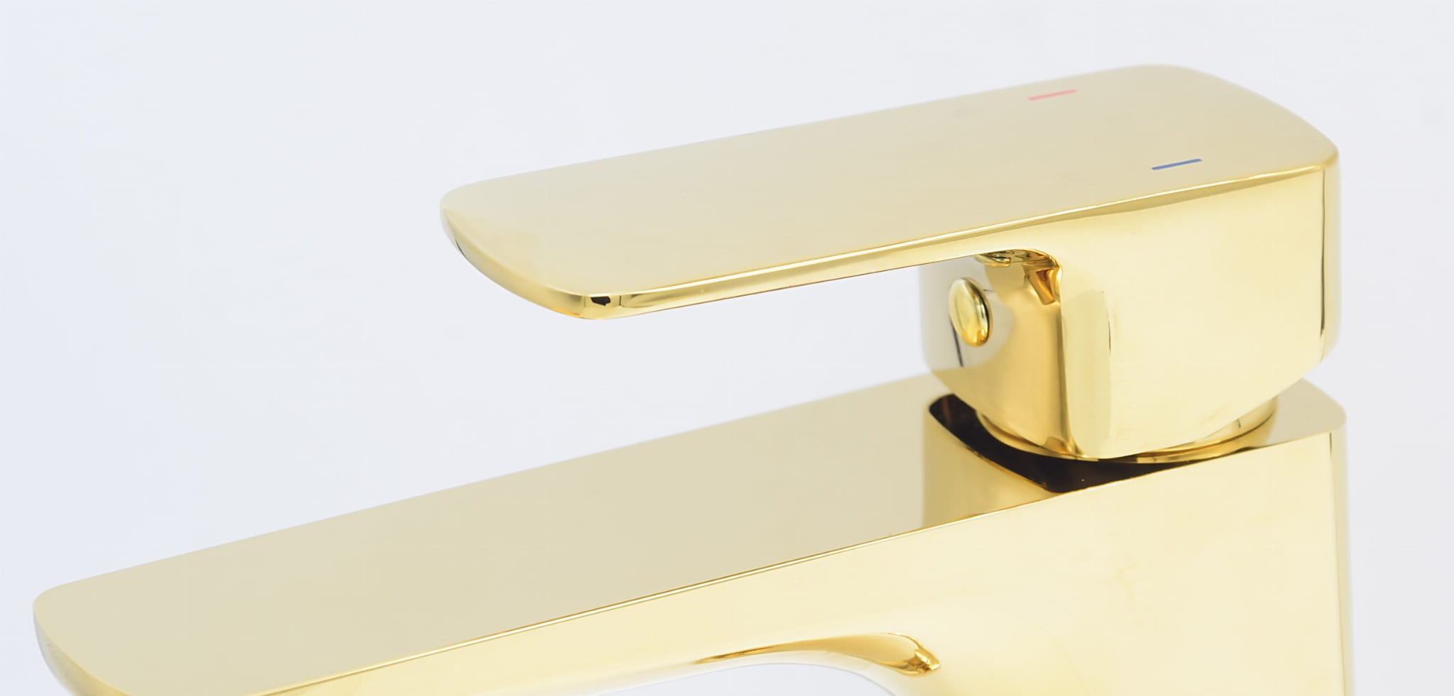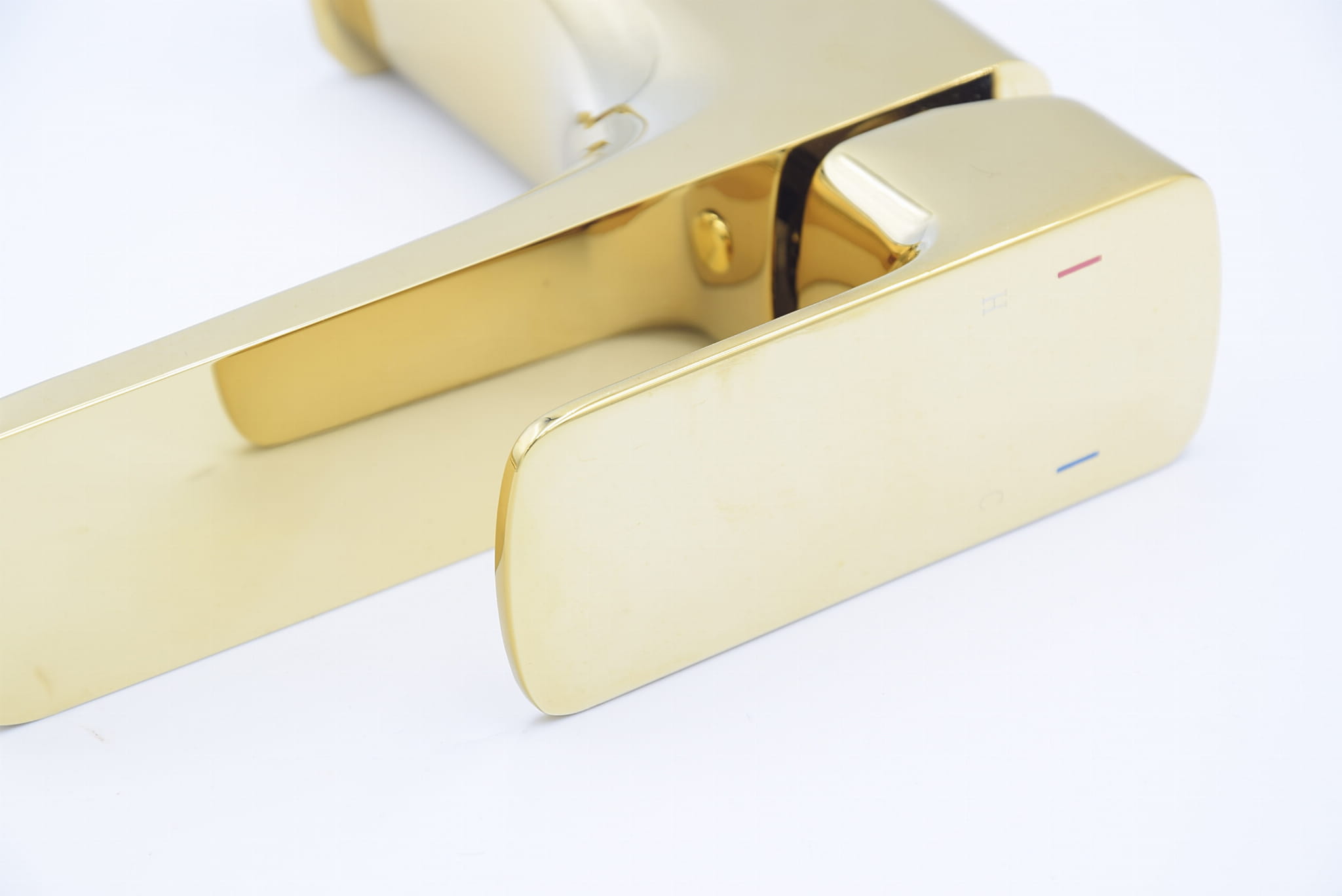 Bateria umywalkowa stojąca Castres o wysokiej jakości, wykonana z mosiądzu, w kolorze złotym. Powłoka baterii odporna na przebarwienia i wysoką temperaturę, ceramiczna głowica. Standardowy otwór montażowy 35 mm. Perlator napowietrzający.