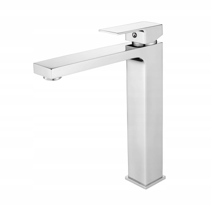 Bateria umywalkowa nablatowa CUBES wysoka, stojąca o wysokiej jakości, wykonana z mosiądzu, w kolorze chrom/połysk. Powłoka baterii odporna na przebarwienia i wysoką temperaturę. Ceramiczna głowica. Standardowy otwór montażowy 35 mm. Perlator wymienny m24.