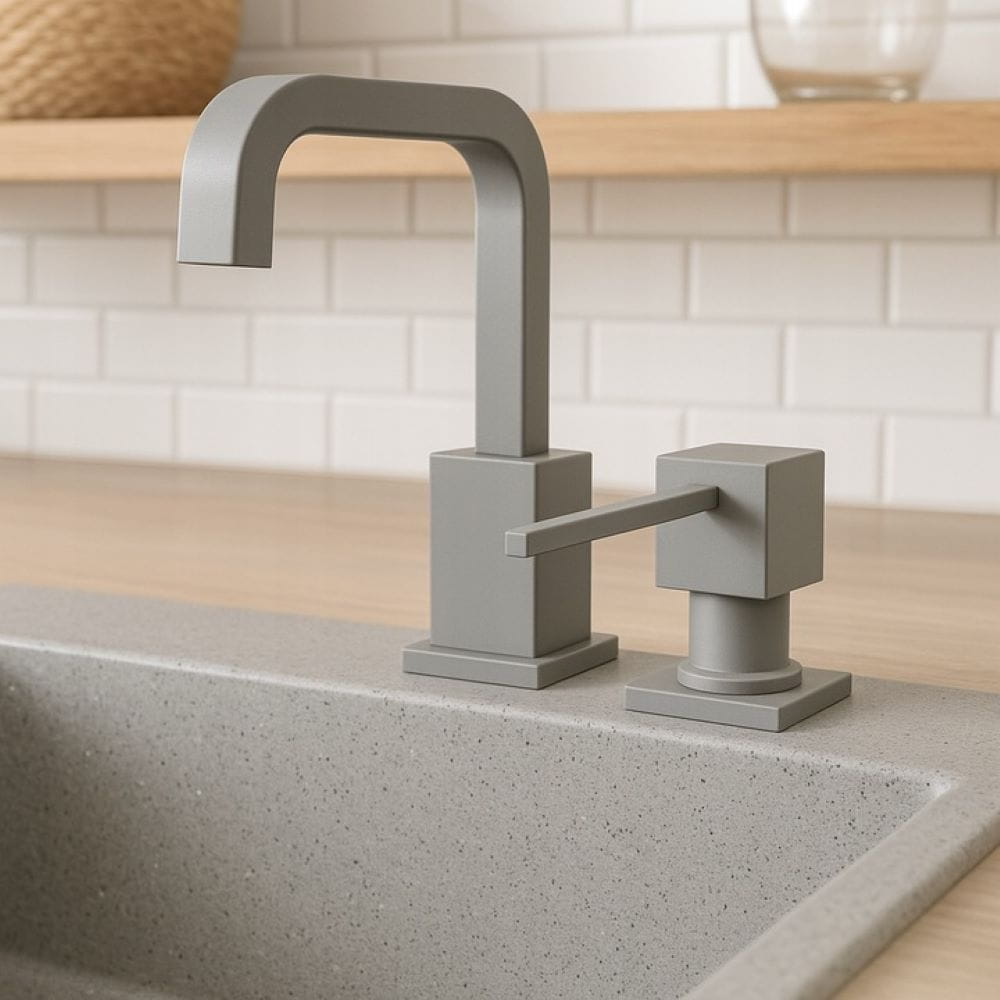 Jasny szary kolor harmonijnie współgra z jasnymi zlewozmywakami granitowymi i stalowymi, dodając im elegancji. Wykonanie z mosiądzu gwarantuje odporność na wilgoć, przebarwienia i zarysowania, dzięki czemu dozownik zachowuje swój wygląd przez długi czas.