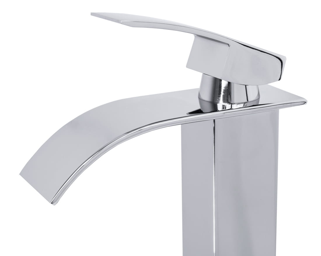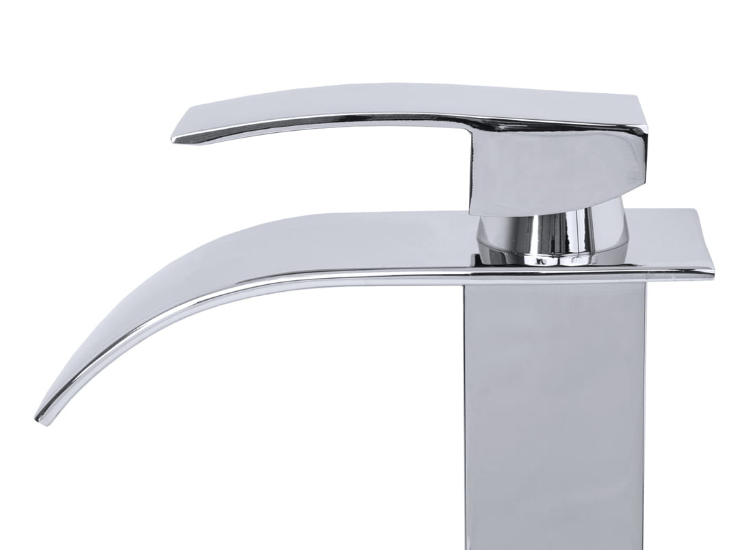 Bateria umywalkowa nablatowa wodospad kaskada o wysokiej jakości, wykonana z mosiądzu, w kolorze chrom/połysk. Powłoka baterii odporna na przebarwienia i wysoką temperaturę. Ceramiczna głowica. Szeroka wodospadowa wylewka. Standardowy otwór montażowy 35 mm.