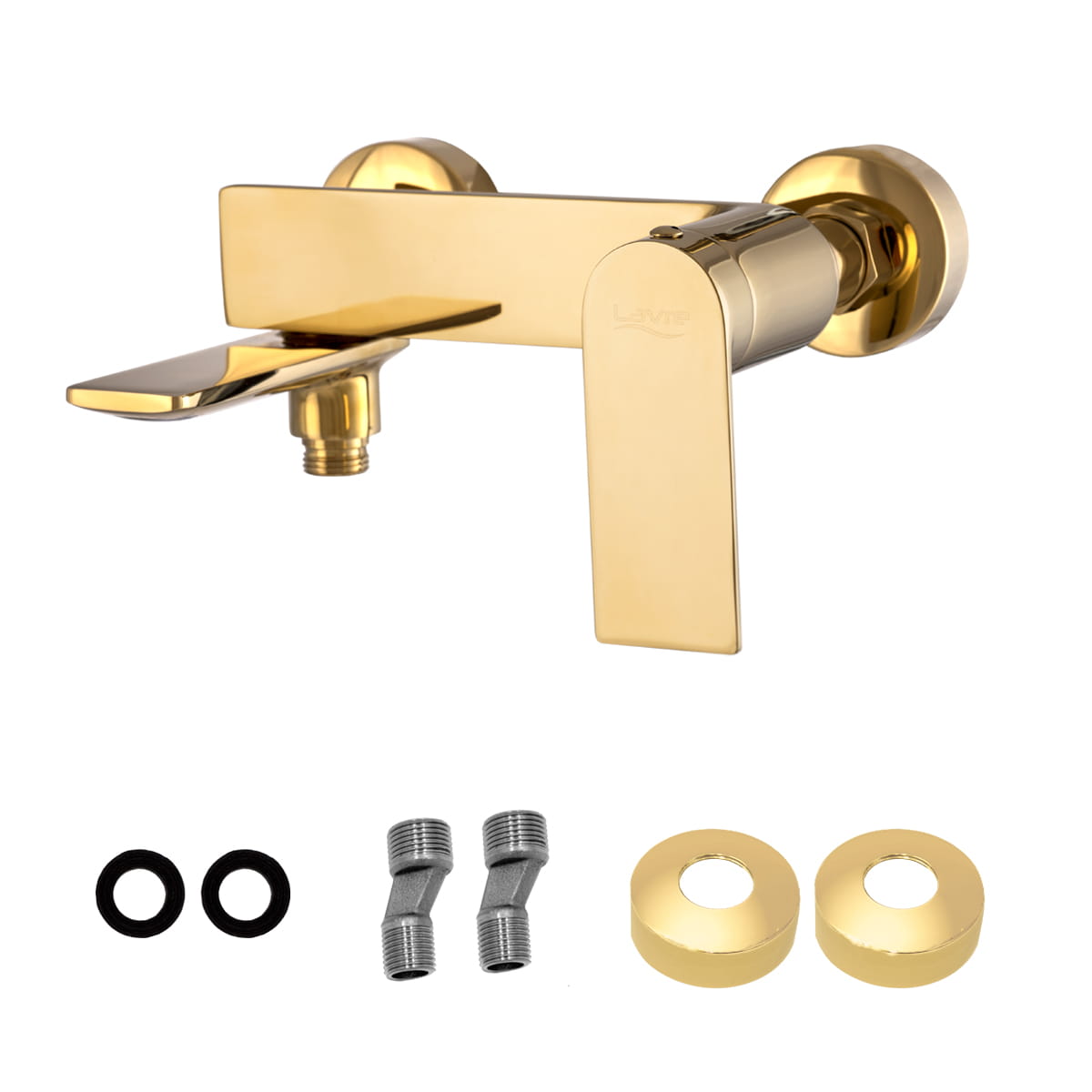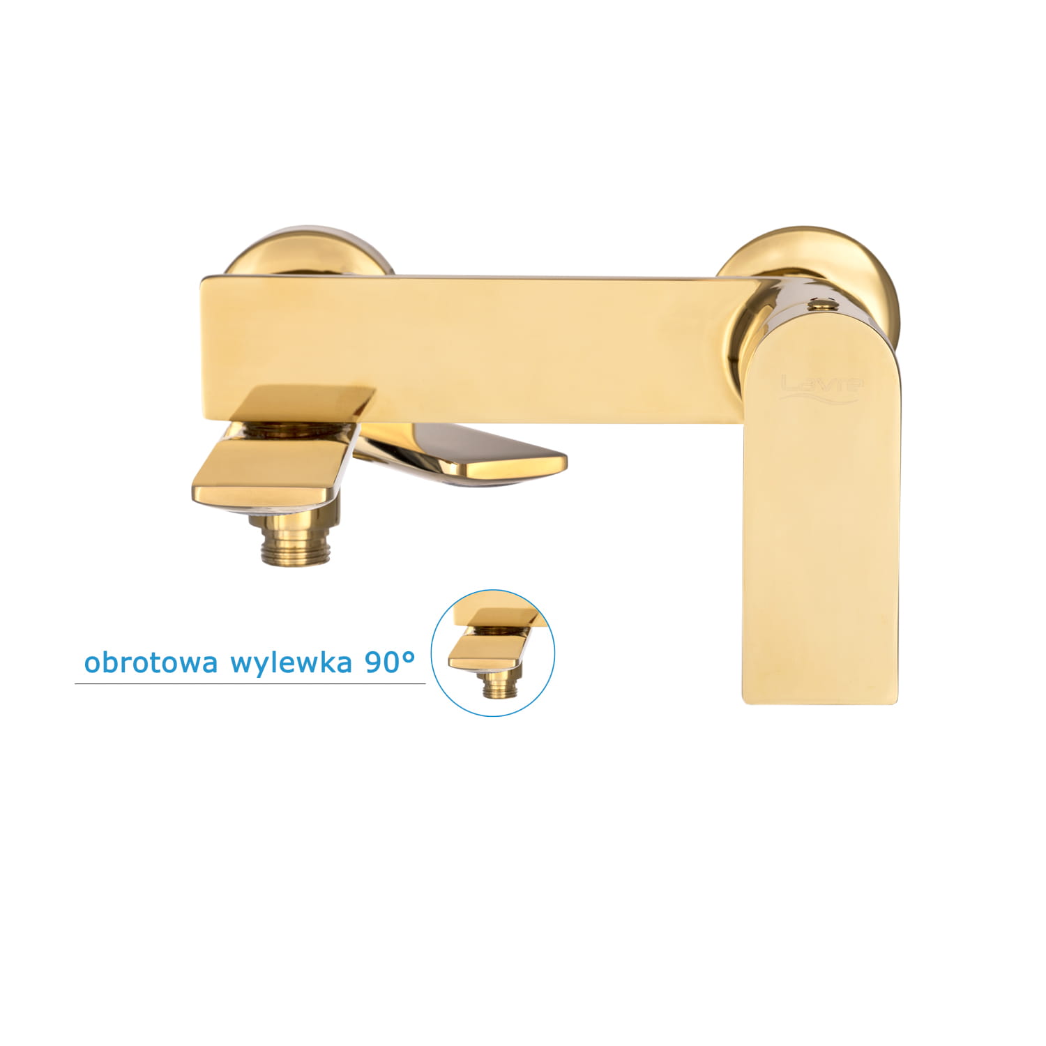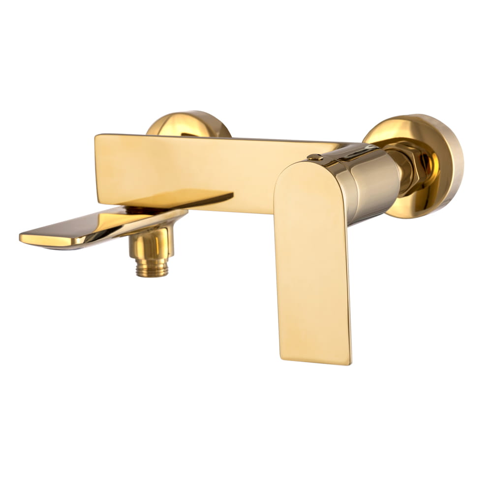 Bateria wannowa FAROS o wysokiej jakości, wykonana z mosiądzu, w kolorze złotym. Powłoka baterii odporna na zarysowania i wysoką temperaturę, ceramiczna głowica. Rozstaw standardowy 150 mm, regulowany na krzywkach od 130 do 170 mm.