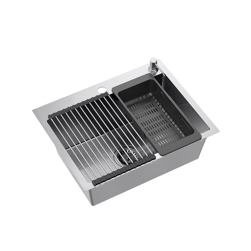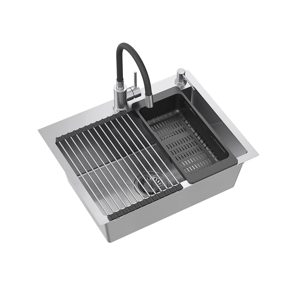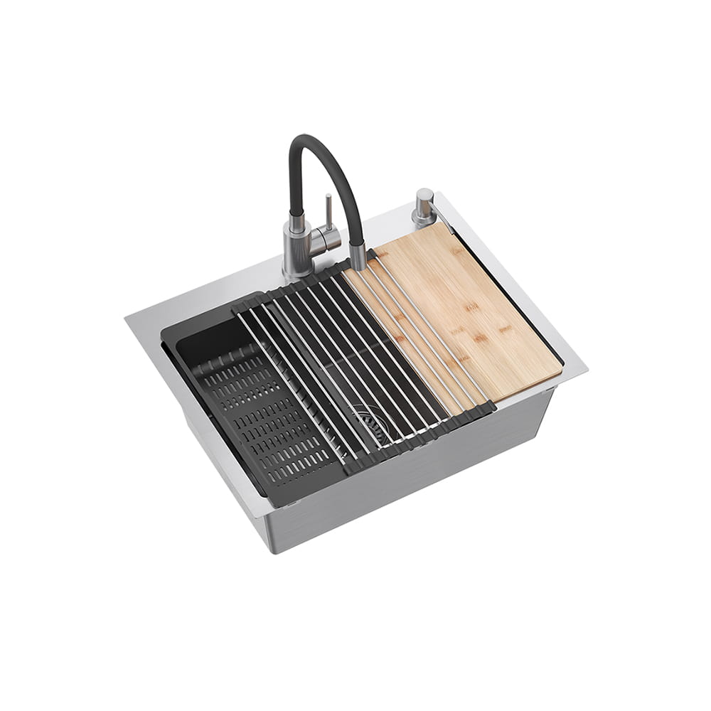 Quadron Luke 110 Workstation zlewozmywak stalowy z syfonem 1-komorowy b/o + Qmata + Wkładka + Dozownik + Deska + bateria z elastyczną wylewką stalowa