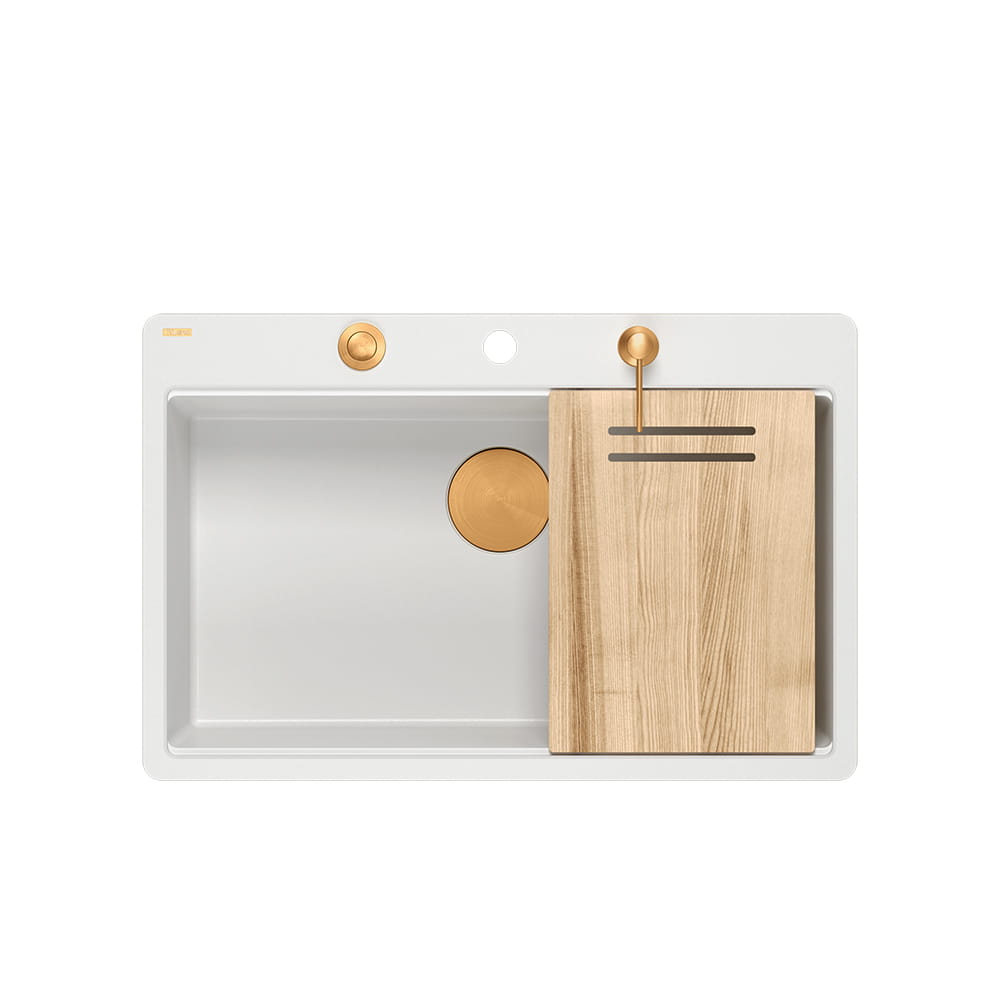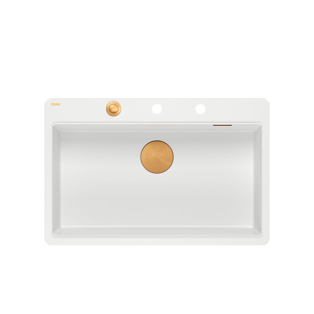 Quadron Marc 110 FM PRODUKT NA ZAMÓWIENIE | granitowy zlewozmywak kuchenny BIAŁY + MIEDŹ PVD | akcesoria: syfon, dozownik, deska | 1-komorowy na równi w blatem