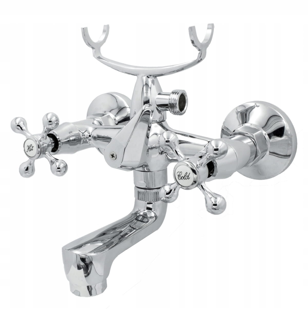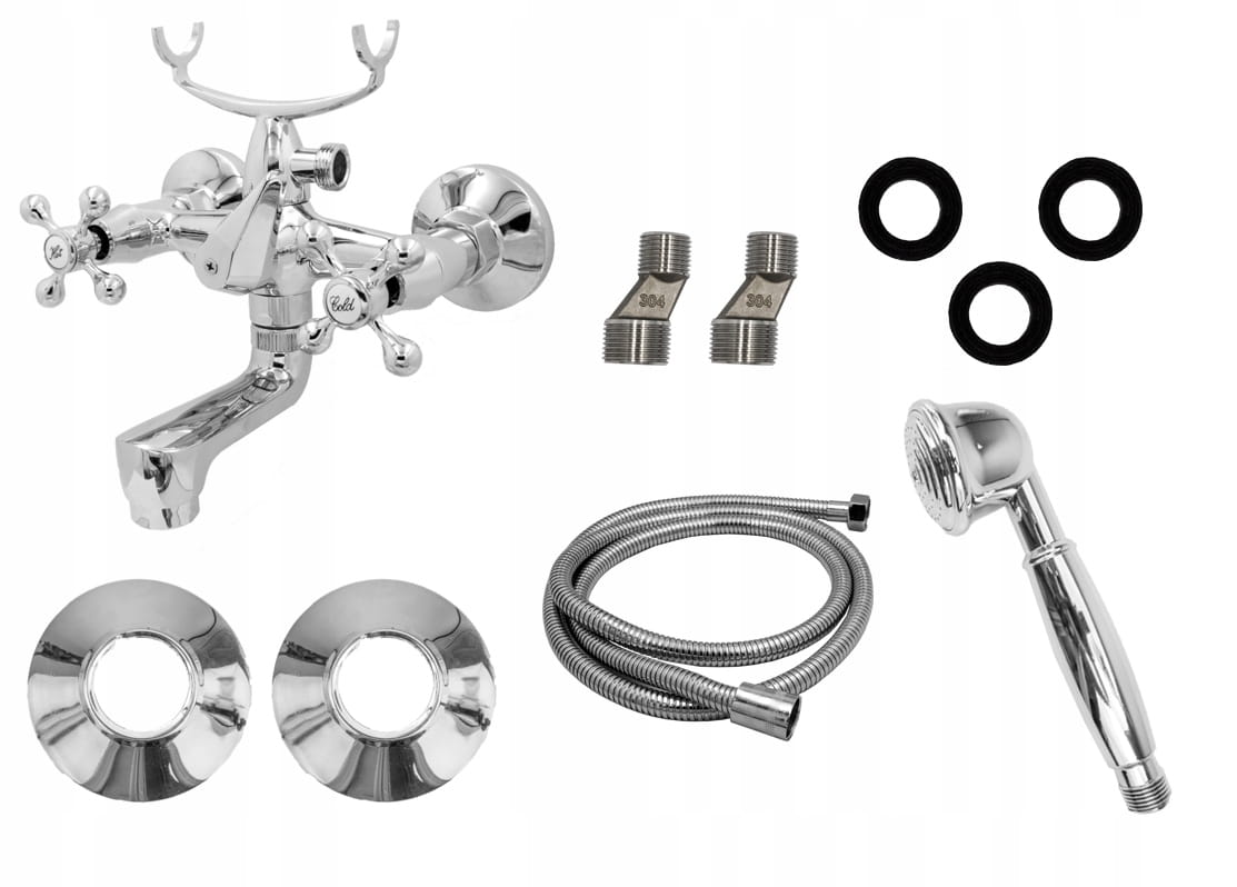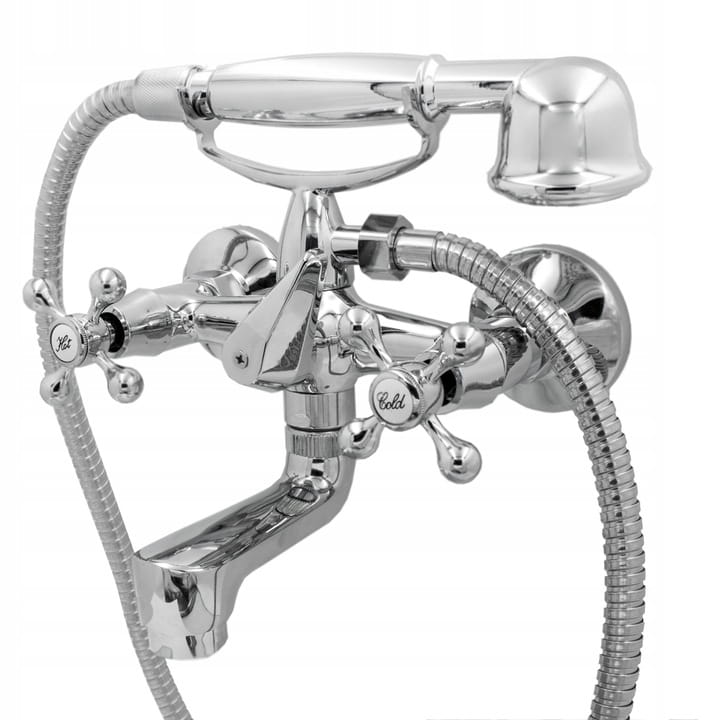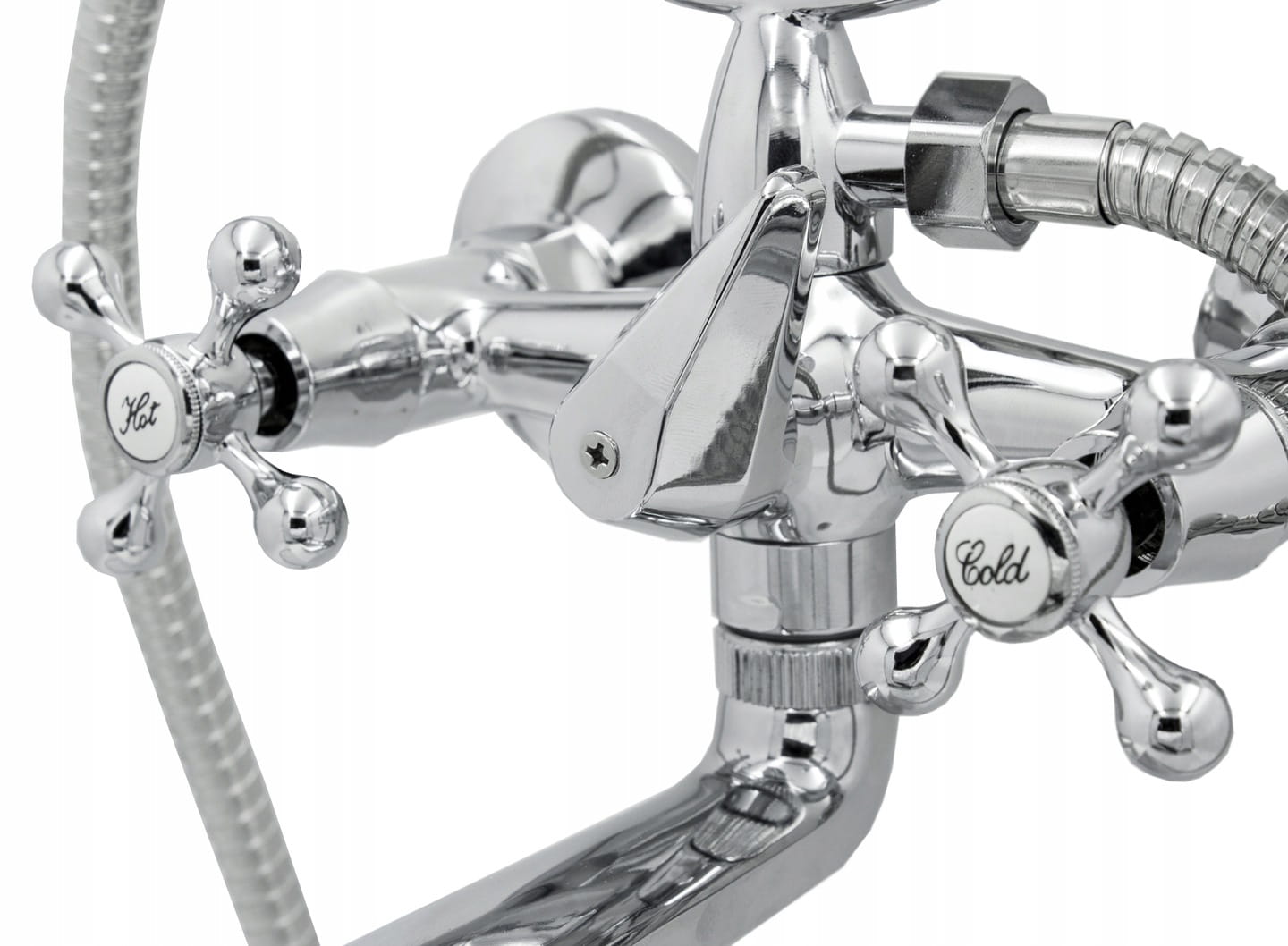 Retro bateria wannowa o wysokiej jakości wykonana z mosiądzu, w kolorze chrom/wysoki połysk. Ceramiczne głowice 1/4 obrotu. Standardowy rozstaw 150 mm, regulowany na krzywkach 130 - 170 mm. Słuchawka wykonana z tworzywa PCV. Chrom odporny na przebarwienia i wysoką temperaturę.
