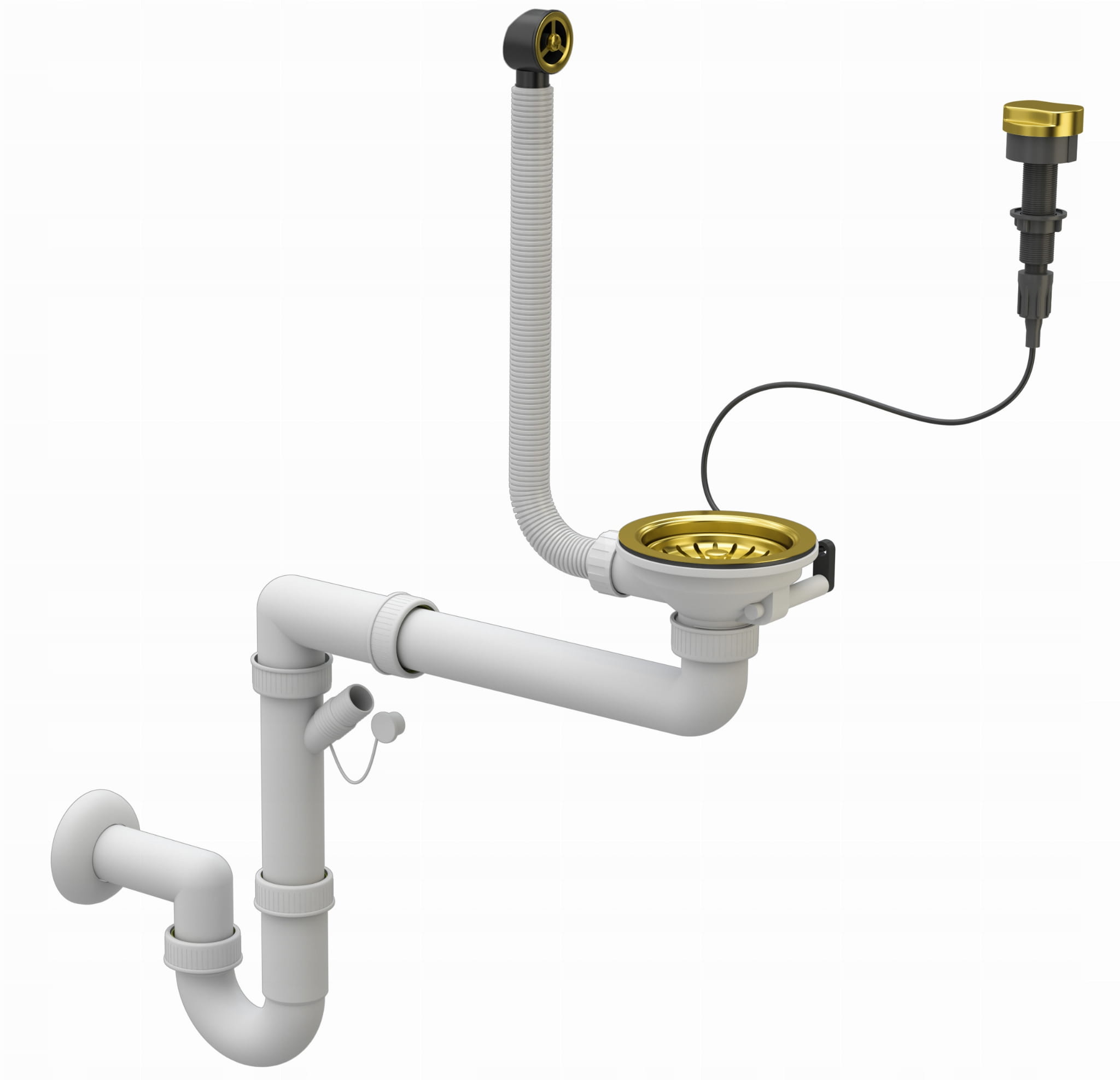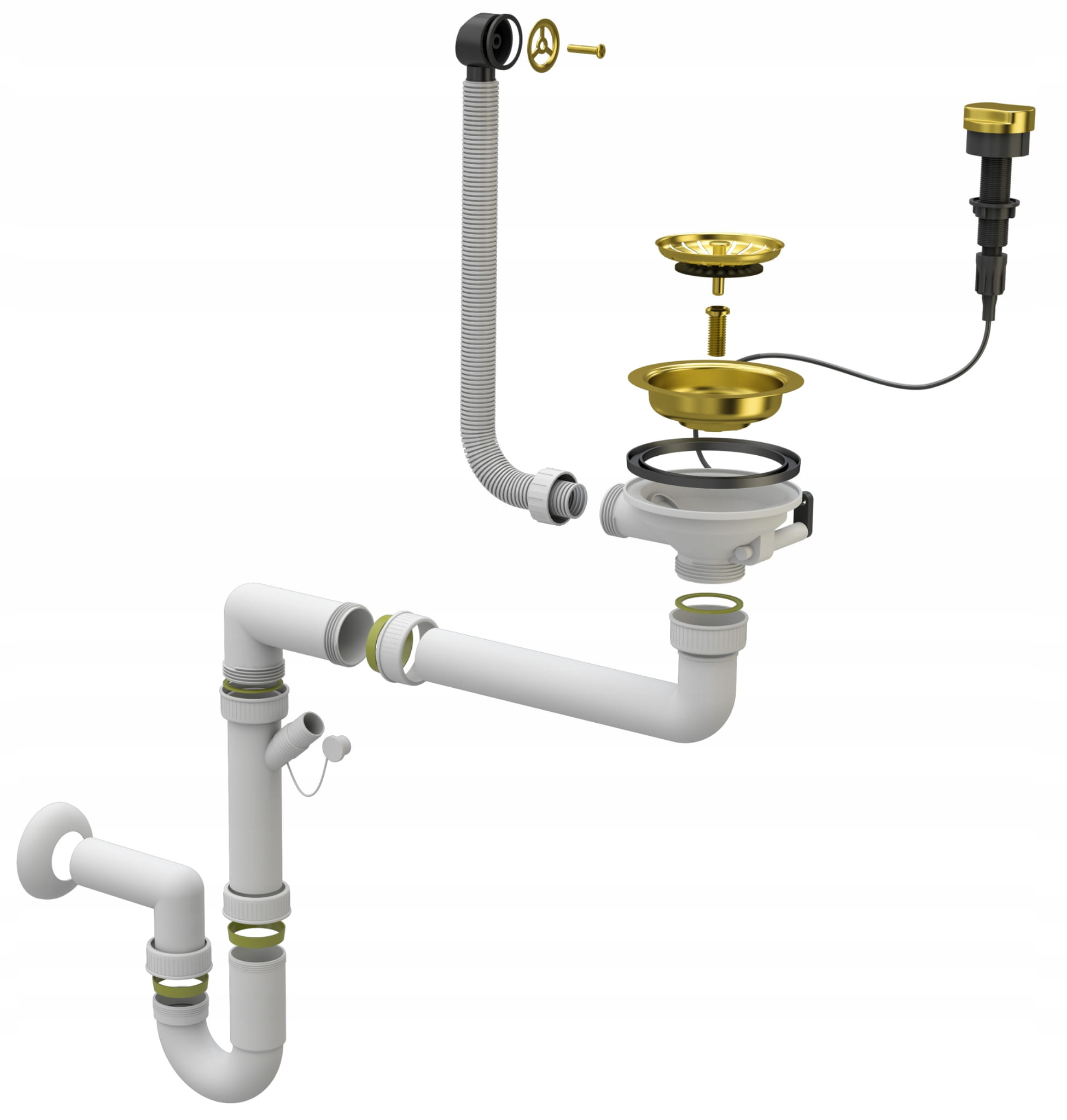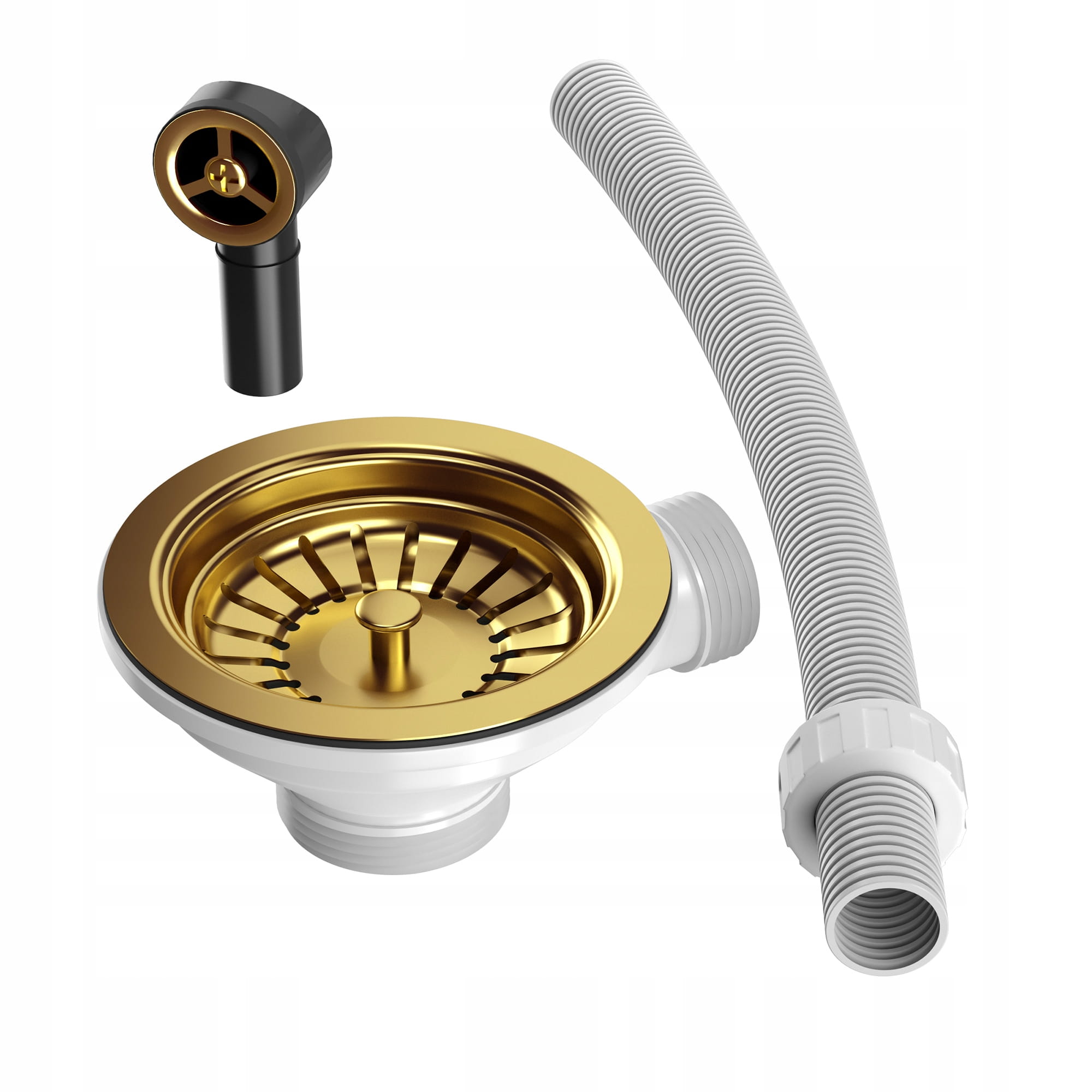 Syfon ZŁOTY przyścienny automatyczny jednokomorowy pasujący do wszystkich naszych granitowych jednokomorowych zlewozmywaków. System oszczędzający przestrzeń. Wykonany z tworzywa PCV i stali nierdzewnej. Możliwość podłączenia pralki lub zmywarki. SITO 3,5'', odpływ 3 1/2. Posiada system antyprzelewowy.