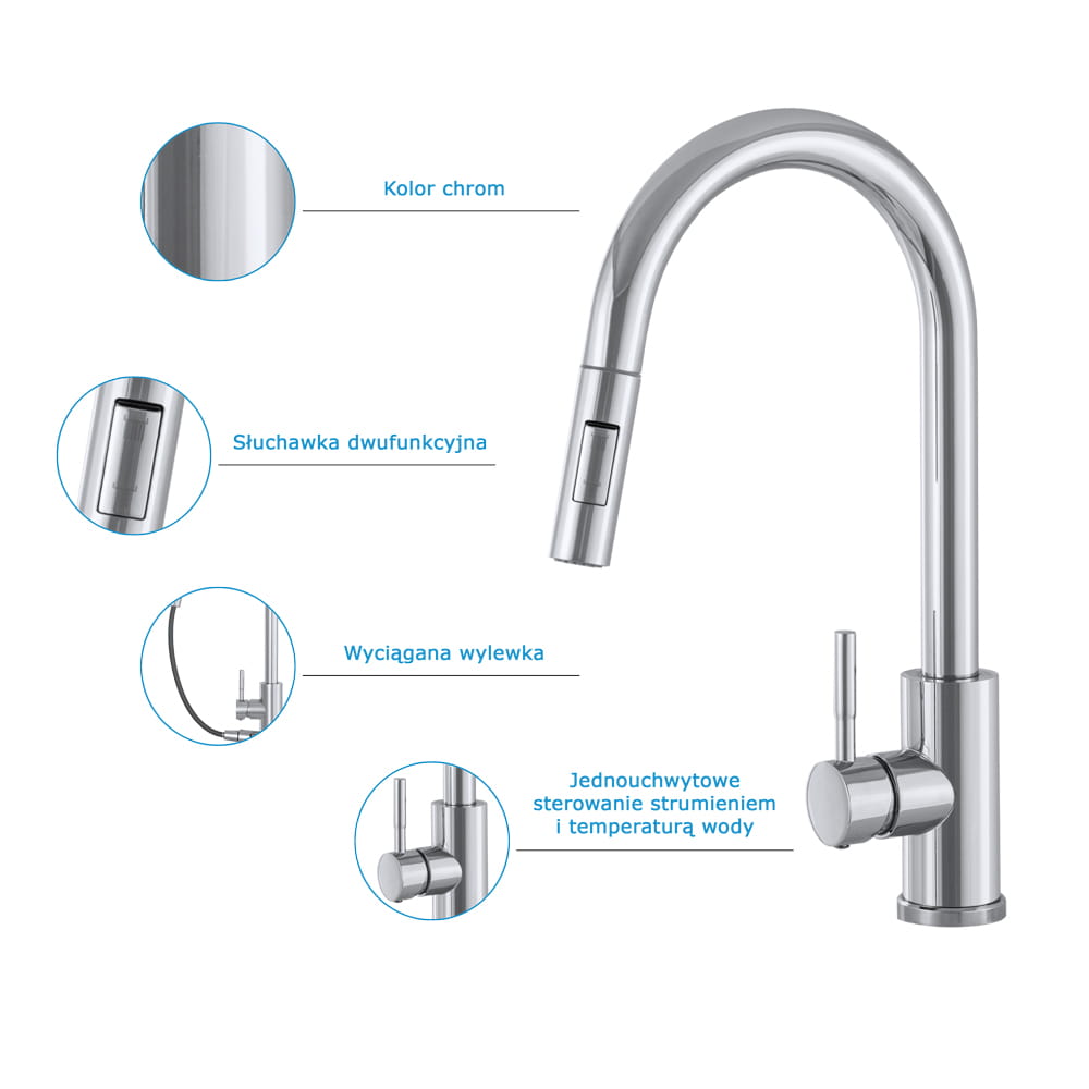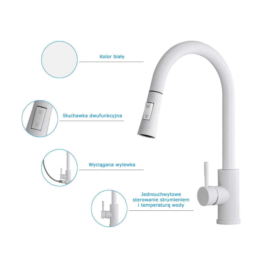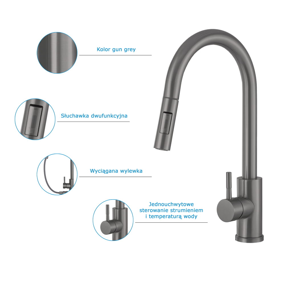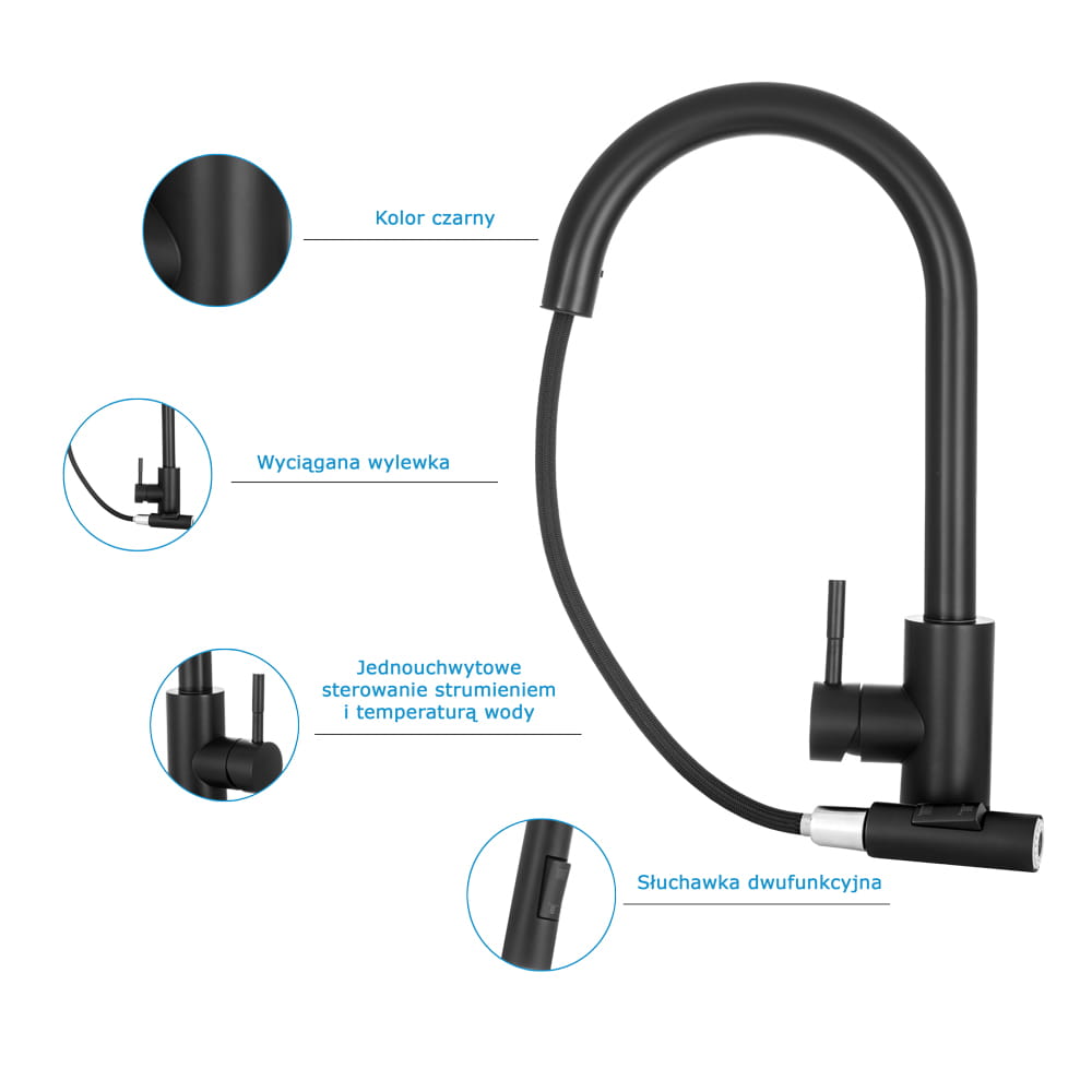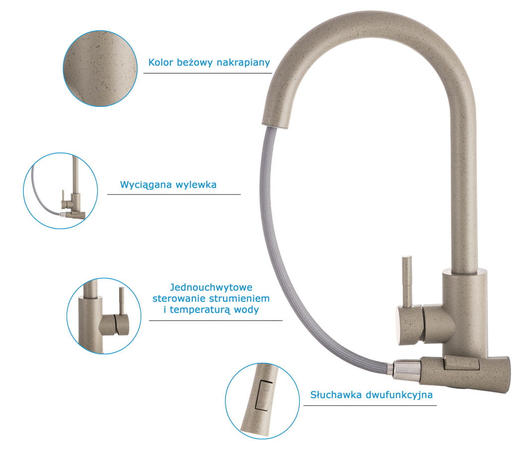 ● Bateria kuchenna TARU z wyciąganą wylewką o wysokiej jakości, wykonana z mosiądzu, w 6 kolorach do wyboru. Powłoka baterii odporna na przebarwienia i wysoką temperaturę. Ceramiczna głowica 40 mm. Obrotowa 360', wyciągana wylewka. Dwufunkcyjna słuchawka (dwa rodzaje strumienia wody). Standardowy otwór montażowy 35 mm.