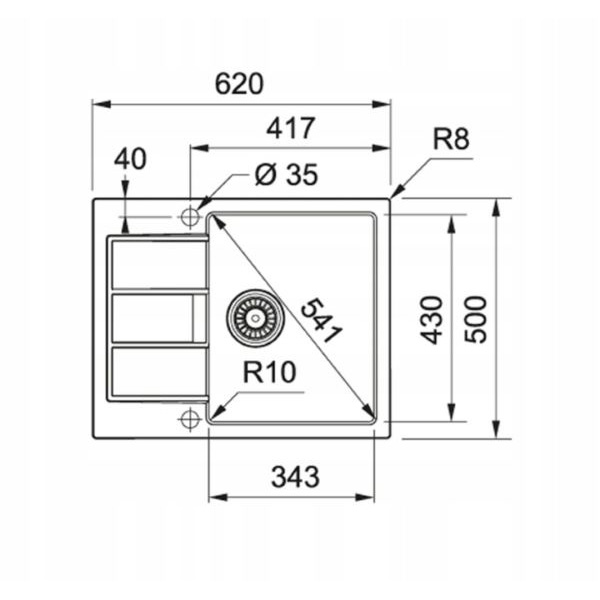 *Zlewozmywak posiada już 2 otwory fabryczne Ø 35 mm umiejscowione na ociekaczu bliżej krawędzi komory do mycia.
