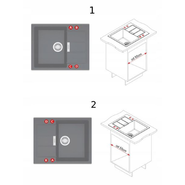 - komora do mycia po lewej stronie - A i C otwory nawiercone są już fabrycznie / B i D oznaczenia dodatkowych miejsc do nawiercenia pod dozownik lub pokrętło syfonu automatycznego