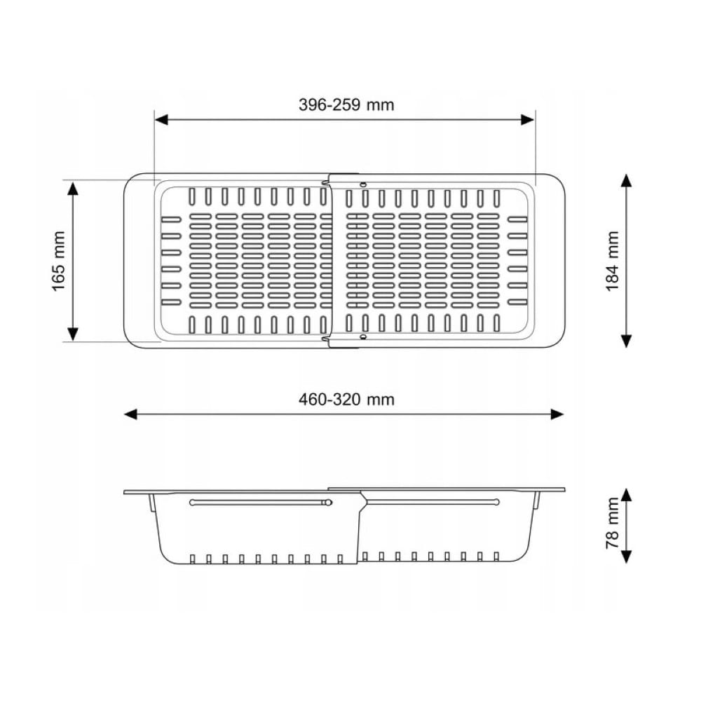 ● Składany koszyk do zlewu. Dzięki regulacji koszyk pasuje do większości zlewozmywaków dostępnych na rynku. Wymiary (produkt złożony): 32 cm x 18,4 cm x 7,8 cm, maksymalne wymiary (po rozłożeniu): 46 cm x 18,4 cm x 7,8 cm.