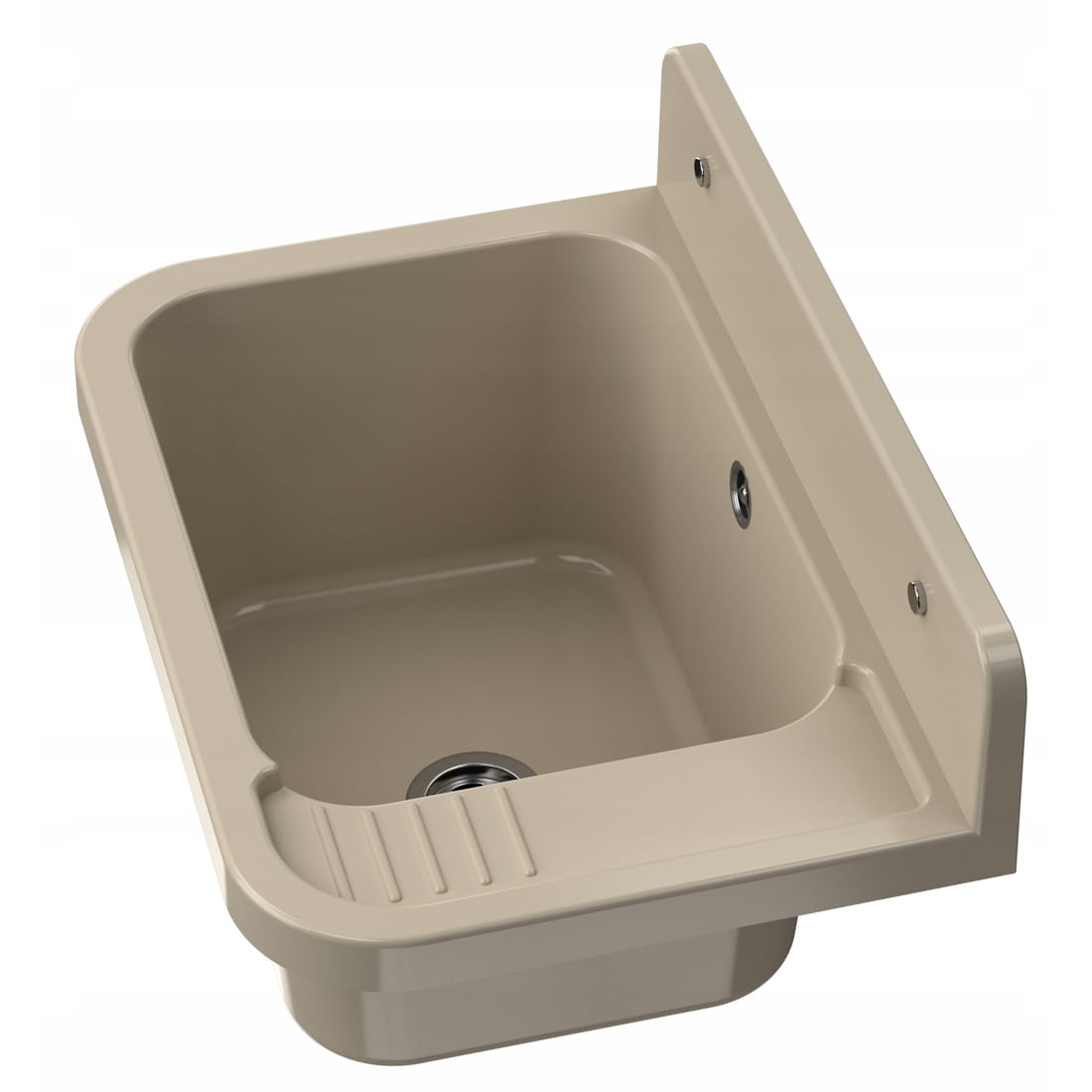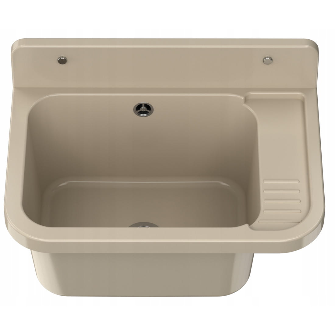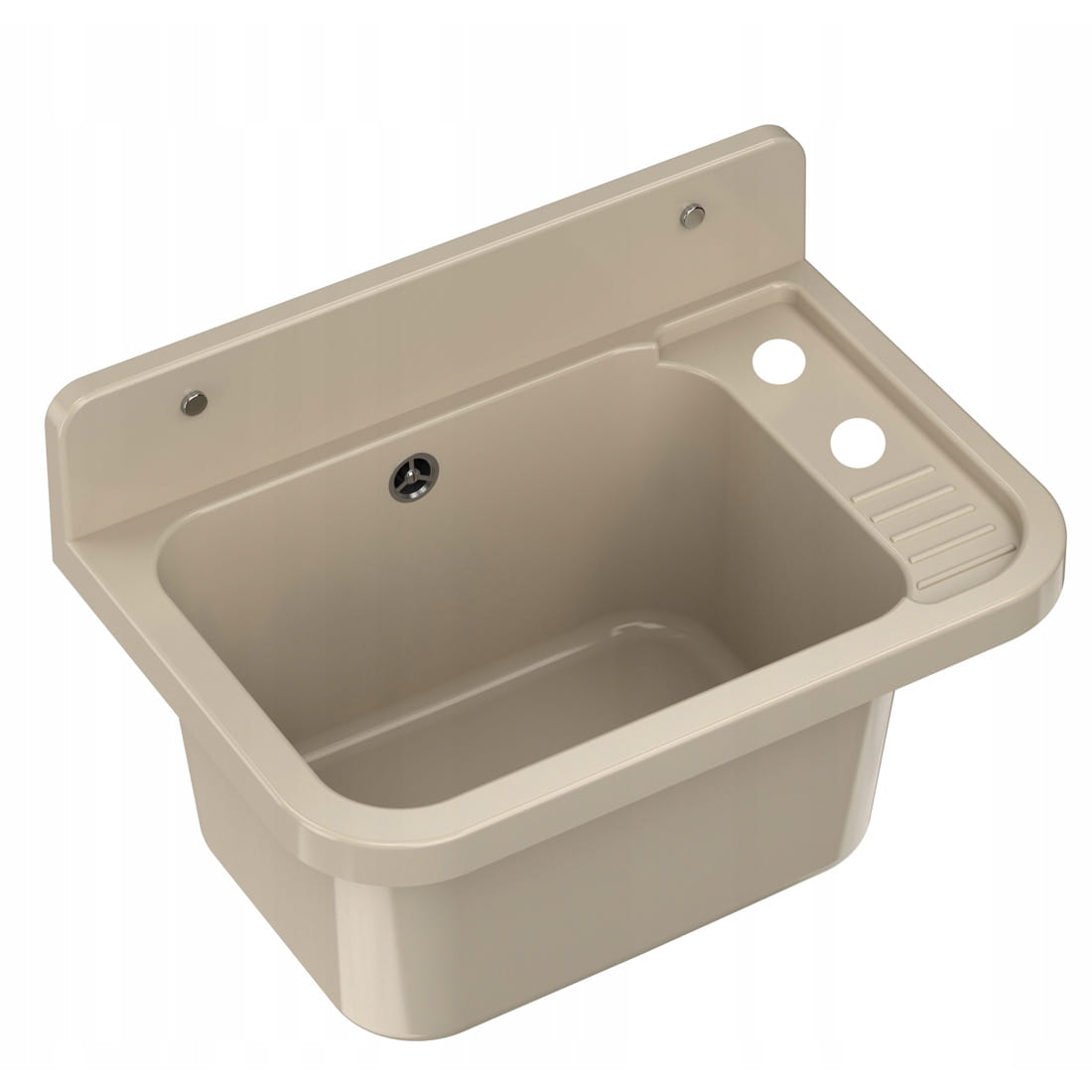 ● Zlew gospodarczy w kolorze beżowym, wykonany z polipropylenu. Odporny na środki chemiczne i wysoką temperaturę. Nadaje się do użytkowania wewnątrz pomieszczeń oraz na zewnątrz. Idealny do garażu, kotłowni, pralni, czy warsztatu. Od spodu zlewozmywaka dwa podcięcia pod baterię i dozownik, wystarczy wybić. W komplecie syfon oraz zestaw montażowy.