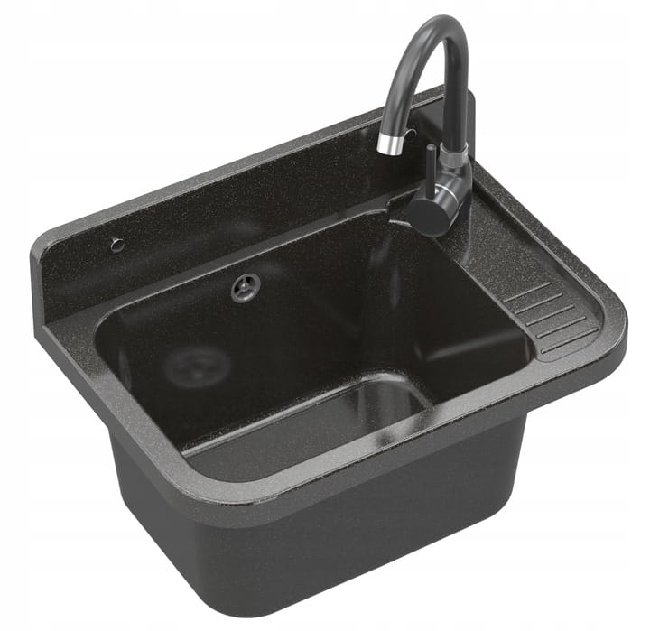 ● Zlew gospodarczy w kolorze czarnym marmurkowym, wykonany z polipropylenu. Odporny na środki chemiczne i wysoką temperaturę. Nadaje się do użytkowania wewnątrz pomieszczeń oraz na zewnątrz. Idealny do garażu, kotłowni, pralni, czy warsztatu. Od spodu zlewozmywaka dwa podcięcia pod baterię i dozownik, wystarczy wybić. W komplecie syfon oraz zestaw montażowy.