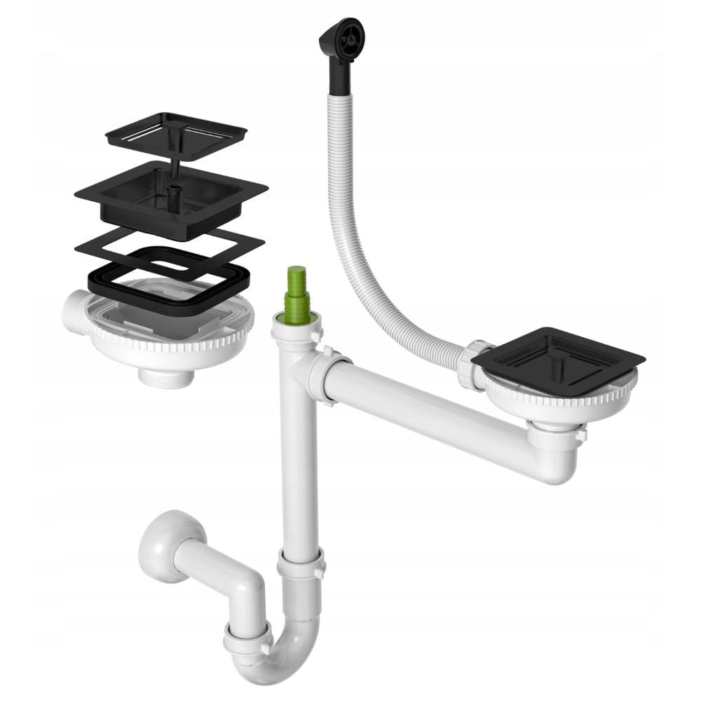● Kwadratowy jednokomorowy syfon manualny oszczędzający miejsce z możliwością podłączenia zmywarki lub pralki (oszczędność przestrzeni).