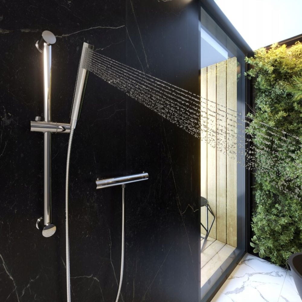 Zestaw prysznicowy z baterią termostatyczną to świetny wybór dla osób, którym zależy na precyzyjnej kontroli temperatury wody podczas kąpieli. Kran utrzymuje stałą temperaturę wody, niezależnie od zmian w ciśnieniu wodociągowym. Pozwala to uniknąć nagłych skoków temperatury, co jest szczególnie przydatne podczas korzystania z prysznica. Model wyposażony jest w blokadę przeciw poparzeniom (38°C), a także wygodne pokrętło do regulacji strumienia wody.