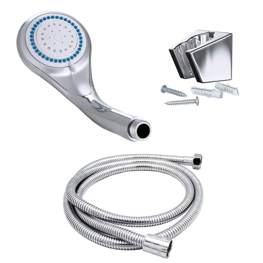 Słuchawka prysznicowa 5- funkcyjna + wąż 150 cm, o wysokiej jakości. Słuchawka wykonana z tworzywa PCV, w kolorze chrom / połysk. Wąż w oplocie metalowym, chromowany. Gwint standardowy 1/2''. Powłoka odporna na przebarwienia i wysoką temperaturę. Dysze z systemem Anticalc. Pasuje do każdej baterii.