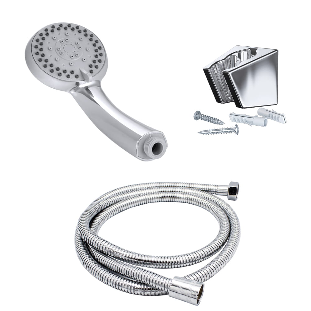 Słuchawka prysznicowa 5- funkcyjna + wąż 150 cm, o wysokiej jakości. Słuchawka wykonana z tworzywa PCV, w kolorze chrom / połysk. Wąż w oplocie metalowym, chromowany. Gwint standardowy 1/2''. Powłoka odporna na przebarwienia i wysoką temperaturę. Dysze z systemem Anticalc. Pasuje do każdej baterii.