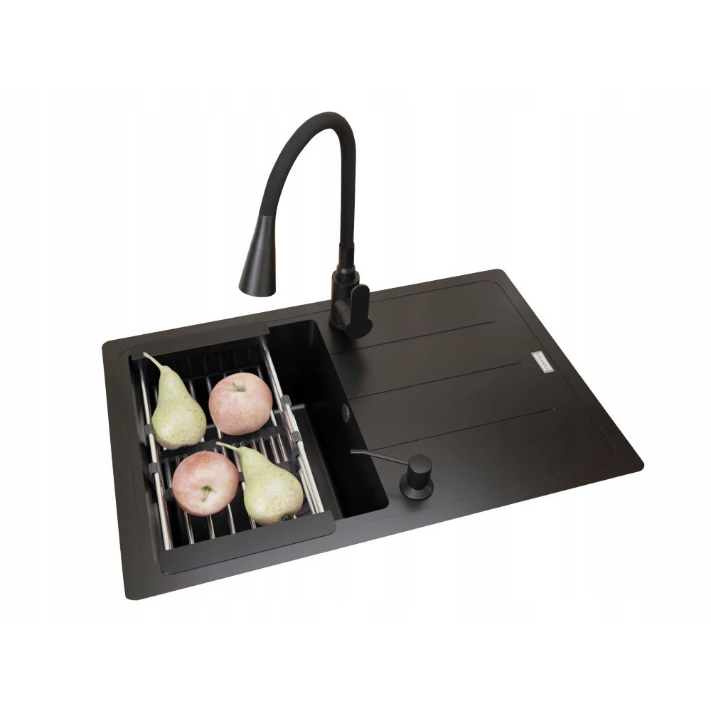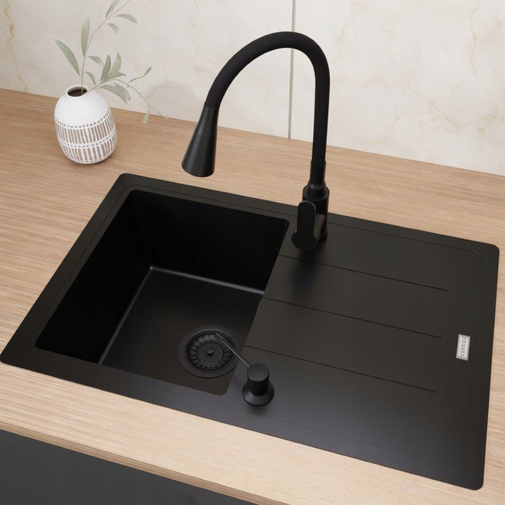 ● Stylowy i funkcjonalny Franke Basis BFG 611-78 to doskonały wybór dla nowoczesnej kuchni. Jednokomorowy zlewozmywak w matowej czerni, wyposażony w ociekacz, zapewnia wygodę użytkowania oraz estetyczny wygląd. Materiał wyprodukowany jest w 80% z prawdziwego granitu, którego głównym składnikiem jest kwarc – jeden z najtwardszych materiałów występujących w przyrodzie. Pozostałe 20% stanowi spoiwo akrylowe, charakteryzujące się wyjątkową wytrzymałością i odpornością. Jego powierzchnia jest idealnie gładka i delikatna w dotyku.