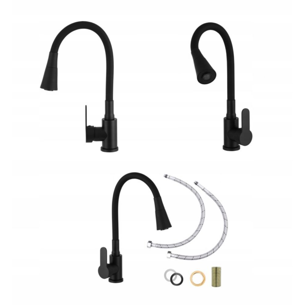 - Bateria kuchenna Reno z elastyczną wylewką – czarna to elegancka i praktyczna bateria stojąca, łącząca nowoczesny design, elastyczną wylewkę 360° oraz dwa tryby strumienia (laminarny i prysznicowy), co zapewnia wygodę podczas codziennego użytkowania. Wykonana z mosiądzu, pokryta matową czernią i wyposażona w ceramiczną głowicę, gwarantuje trwałość, a jednouchwytowe sterowanie umożliwia precyzyjną regulację temperatury i ciśnienia wody.