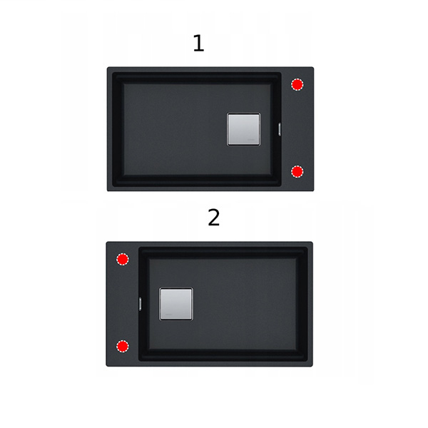 Ważna informacja - 2 otwory zaznaczone w czerwonych kółkach z przerywaną zewnętrzną linią o wymiarze Ø 35 mm pod np. baterię, dozownik, przycisk młynka do odpadów trzeba samodzielnie wybić lub dokończyć wiercenie sfrezowanych fabrycznie otworów otwornicą do gresu Ø 35 w przypadku kiedy chcemy umieścić akcesoria w zlewie (bateria, dozownik czy też przycisk). Oczywiście można też baterię lub dozownik zamontować w blacie co jest pokazane na zdjęciach.