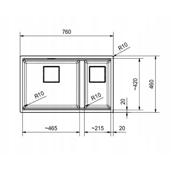 Mały promień zaokrąglenia komory (10 mm) sprawia, że zlewozmywak wygląda nowocześnie i łatwo jest go utrzymać w czystości. Duża pojemność komory ułatwia mycie naczyń i innych dużych przedmiotów, takich jak blachy do pieczenia.