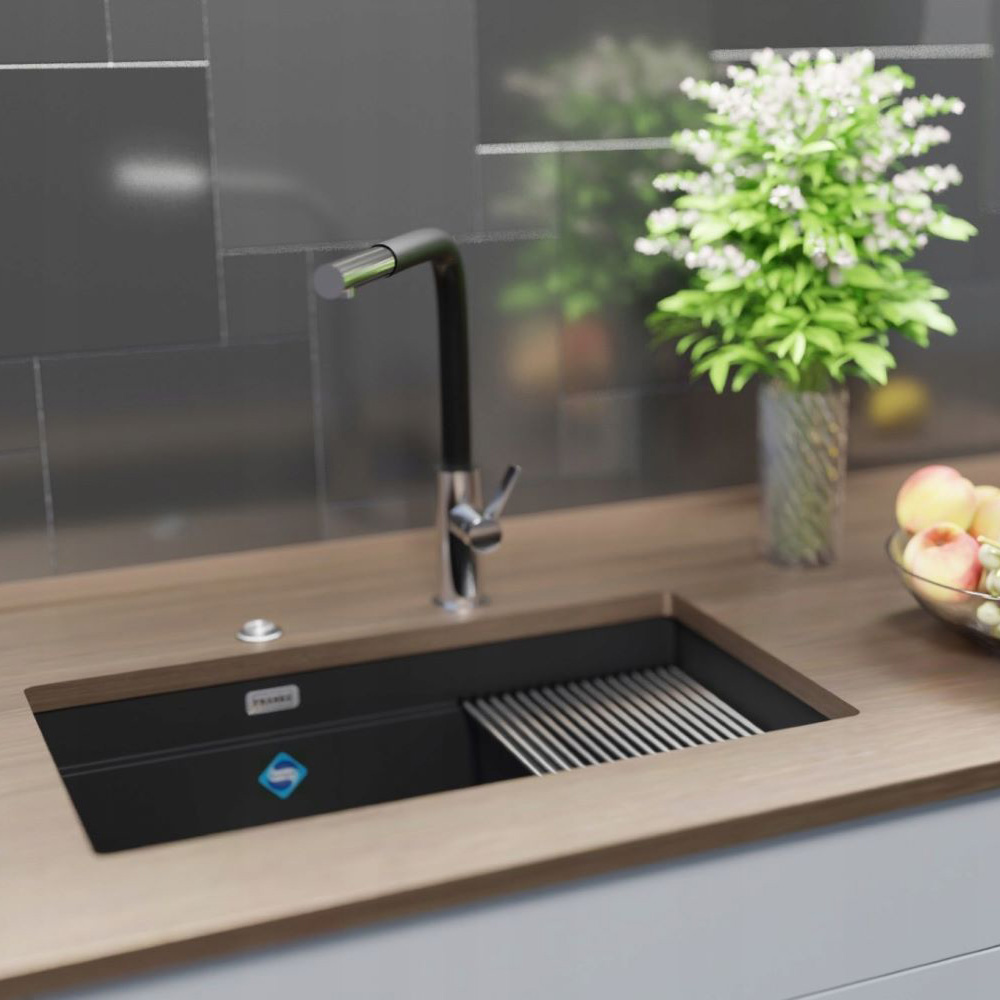 ● Zlewozmywak Franke Kanon KNG 160 w kolorze Onyx (czarny nakrapiany) lub czarny mat. Materiał wyprodukowany jest w 80% z prawdziwego granitu, którego głównym składnikiem jest kwarc – jeden z najtwardszych materiałów występujących w przyrodzie. Pozostałe 20% stanowi spoiwo akrylowe, charakteryzujące się wyjątkową wytrzymałością i odpornością. Jego powierzchnia jest idealnie gładka i delikatna w dotyku. Prezentowany zestaw to kumulacja innowacji w najlepszym tego słowa znaczeniu. Zainwestuj raz a dobrze z Franke i ciesz się przez lata produktami tej marki. Perfekcja wykonania w połączeniu z praktycznym wykorzystaniem jest kluczem do sukcesu w każdej kuchni.
