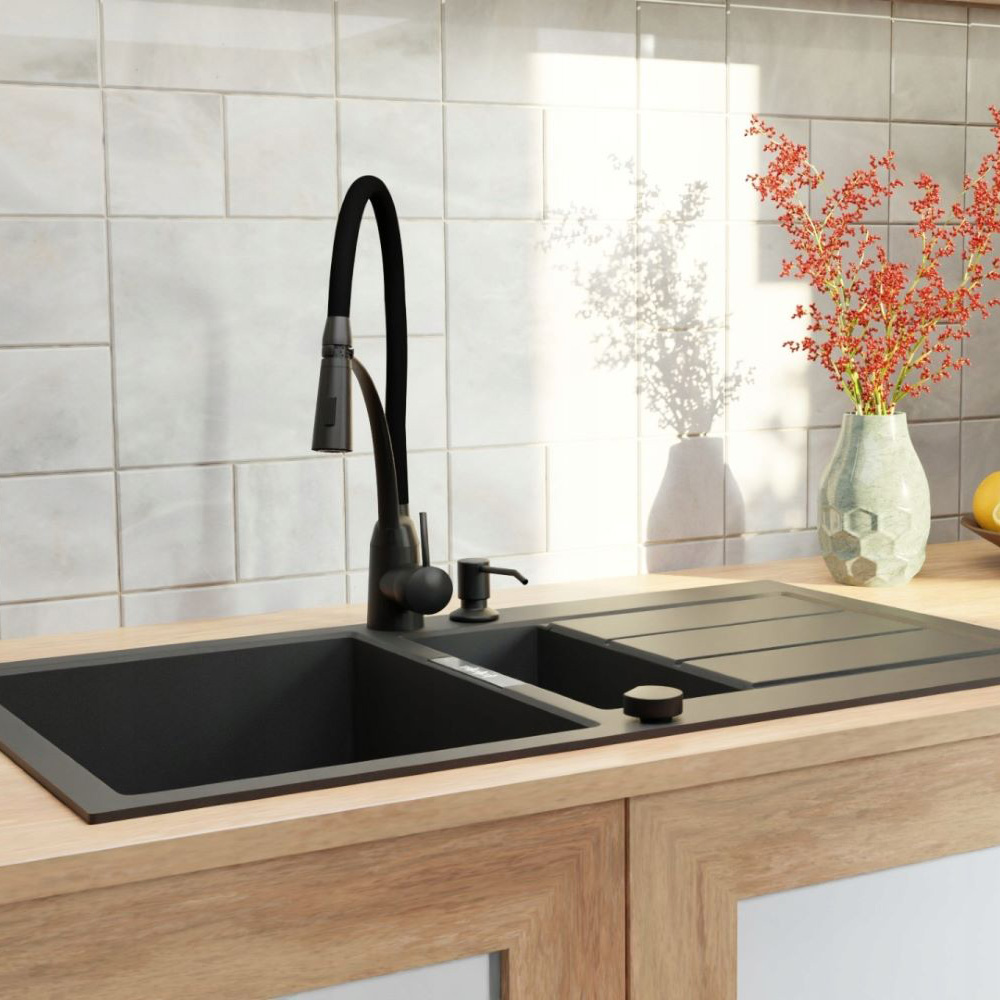 ● Bateria kuchenna NEXO to połączenie nowoczesnego designu i funkcjonalności, idealnie komponujące się z każdą kuchnią. Wykonana z wysokiej jakości mosiądzu, zapewnia trwałość i odporność na korozję. Dwufunkcyjna słuchawka pozwala na łatwe przełączanie między strumieniem standardowym a prysznicowym, dostosowując się do różnych potrzeb użytkownika. Bateria w dwóch wariantach kolorystycznych.