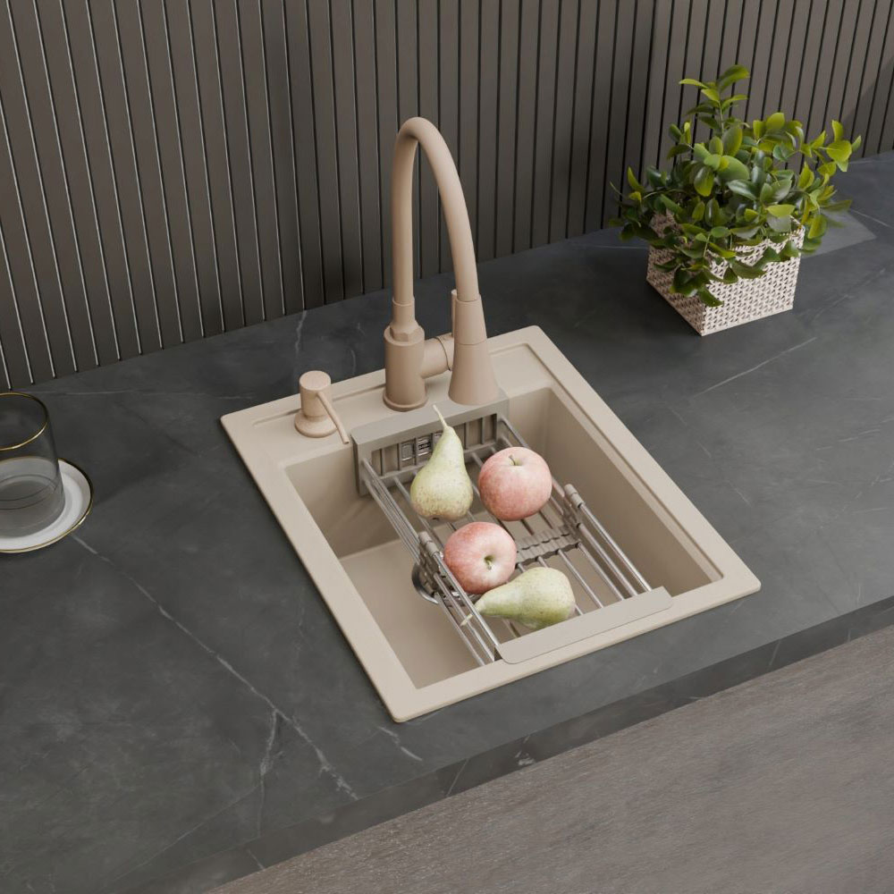 ● Bateria kuchenna Selva w eleganckim, beżowym odcieniu świetnie sprawdzi się podczas codziennych obowiązków przy zlewie. Elastyczna wylewka pozwala swobodnie kierować strumień wody tam, gdzie akurat tego potrzebujesz, a dwa tryby pracy – klasyczny oraz deszczowy – umożliwiają szybkie dostosowanie działania do różnych zadań. Dzięki solidnemu wykonaniu z wytrzymałych materiałów armatura ta pozostanie niezawodna nawet przy częstym użytkowaniu.