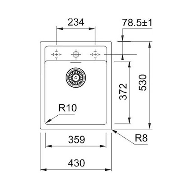 Stojąc przodem do zlewozmywaka 2 otwory Ø35 mm są już nawiercone pod baterię i dozownik do płynów.