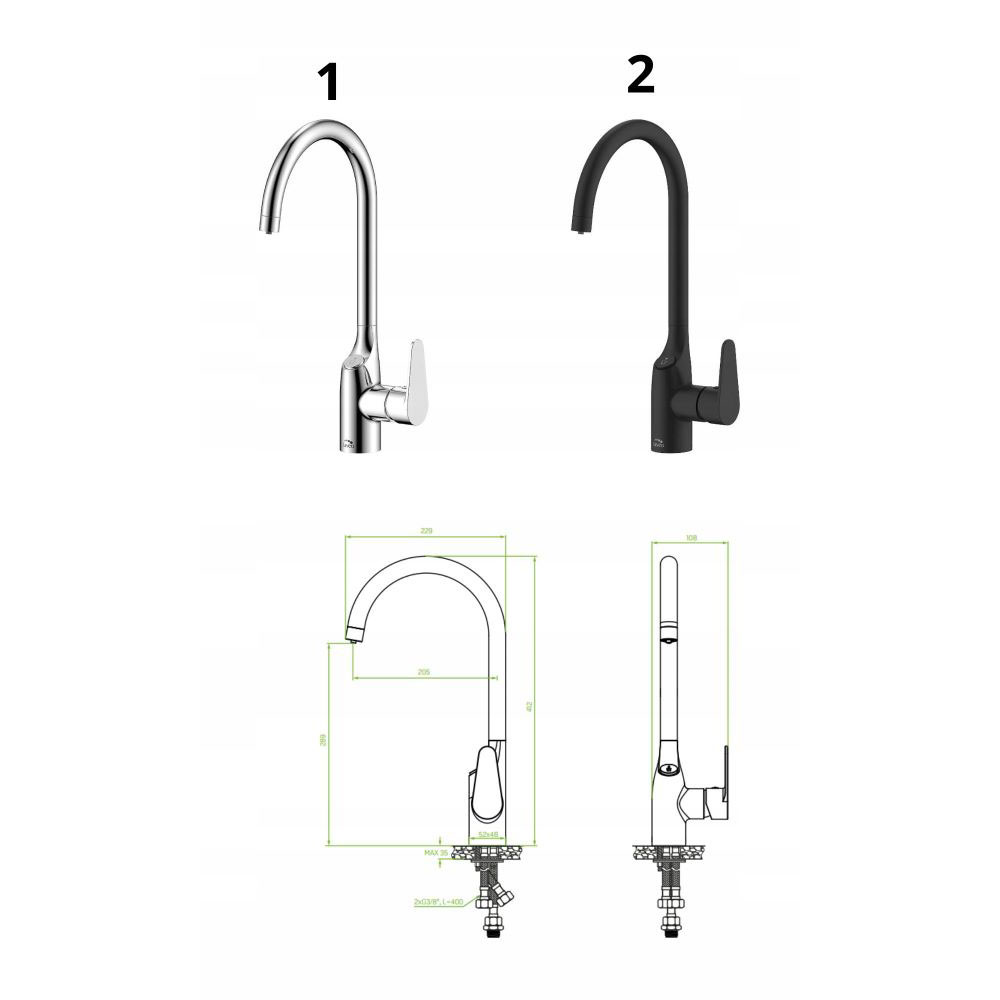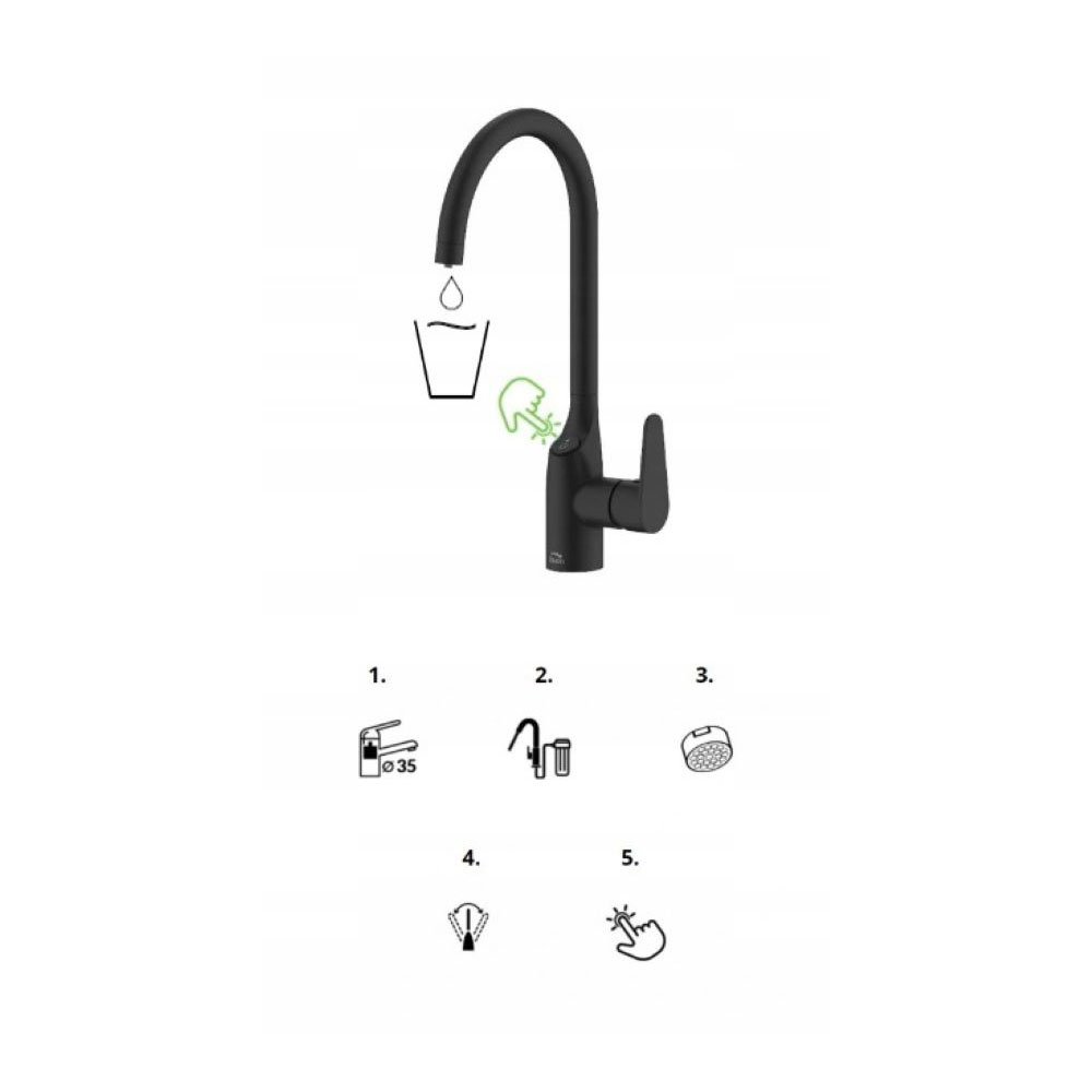 ● Model baterii kuchennej z podłączeniem do filtra wody. Znajdujący się w baterii dodatkowy wężyk pozwala na bezproblemowe podłączenie filtra, który będzie ukryty w szafce. Seria wyposażona jest w przycisk, którym w łatwy sposób możemy zmienić strumień wody ze zwykłej (kranowej) na przefiltrowaną. Takie udogodnienie pozwala na picie wody prosto z kranu, ograniczając tym samym zużycie plastiku, dzięki ograniczeniu zakupów wody w butelkach. Jednouchwytowy model ma ruchomą, zaokrągloną wylewkę. Delikatne kształty baterii oraz czarne wykończenie pomogą wprowadzić do kuchni ciekawy design wraz z niezastąpioną funkcjonalnością. Bateria dostępna w dwóch wariantach kolorystycznych.