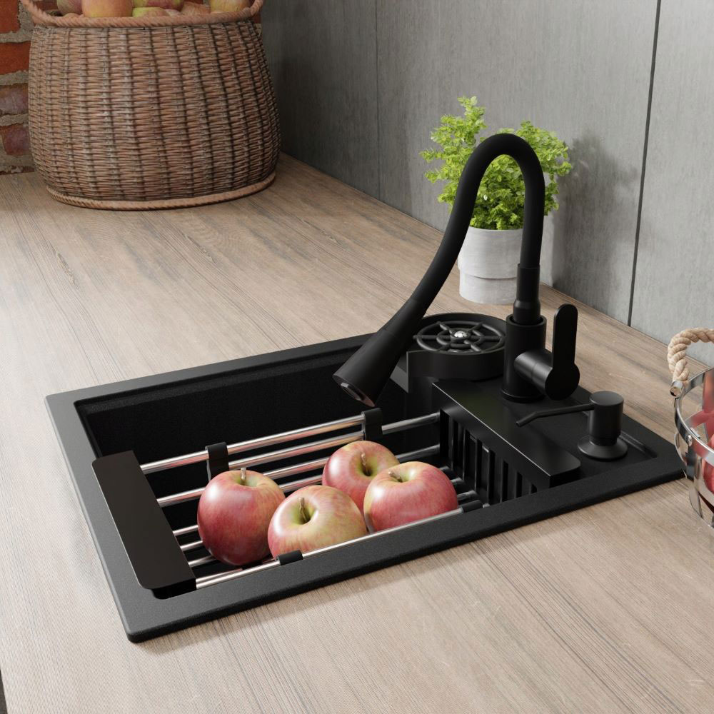 - Bateria kuchenna Reno z elastyczną wylewką – czarna to elegancka i praktyczna bateria stojąca, łącząca nowoczesny design, elastyczną wylewkę 360° oraz dwa tryby strumienia (laminarny i prysznicowy), co zapewnia wygodę podczas codziennego użytkowania. Wykonana z mosiądzu, pokryta matową czernią i wyposażona w ceramiczną głowicę, gwarantuje trwałość, a jednouchwytowe sterowanie umożliwia precyzyjną regulację temperatury i ciśnienia wody.
