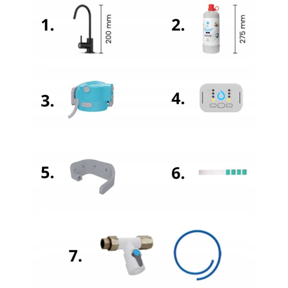 Zestaw Dafi Flow Comfort zawiera: Kran jednodrożny ALTO w kolorach chrom lub czarnym matowym dedykowany do wody filtrowanej; Jeden wkład filtrujący D 1, poprawiający smak wody kranowej i redukujący jej nadmierną twardość; Głowicę wkładu filtrującego wodę; Elektroniczny, inteligentny wskaźnik LED wymiany wkładu filtrującego; Uchwyt do montażu filtra wody na ścianie; Pasek do badania twardości wody; Trójnik z zaworem, elastyczny wężyk.