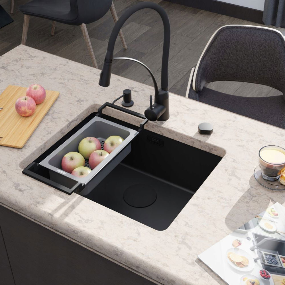 ● Zlewozmywak z linii Maris MRG 210/110-52 można montować na dwa sposoby: podbudowany pod blatem lub na równi z blatem. Zlewozmywak wyprodukowany jest z Fragranitu+, który składa się w 80% z naturalnego granitu. Dzięki zastosowaniu bardzo drobnych cząsteczek granitu, uzyskano zlewozmywak idealnie gładki i delikatny w dotyku. Wszystkie zlewozmywaki fragranitowe FRANKE, wyprodukowane są z wykorzystaniem technologii Sanitized®. Zawierają zatem szkło fosforanowe z dodatkiem srebra, ograniczającym rozwój bakterii do 99%. Co więcej, zlewozmywaki z Fragranitu+ są odporne na zarysowania, uderzenia i zaplamienia, a ich kolor nie zmienia się z upływem czasu. Są również odporne na krótkotrwałe działanie wysokiej temperatury (do 280°C przez 15 sek.).