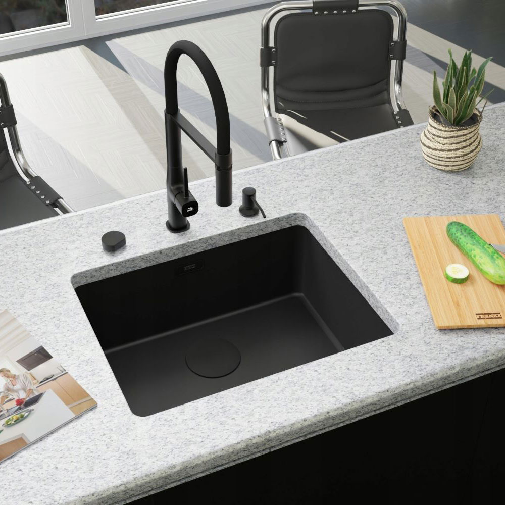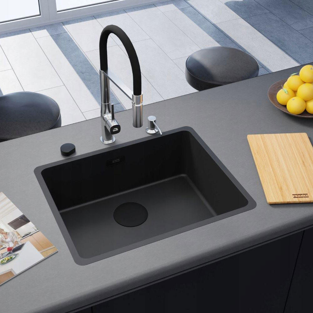 ● Syfon automatyczny (sterowanie odpływem poprzez pokrętło) z możliwością podłączenia pralki lub zmywarki - odpływ syfonu, osłonka odpływu oraz przelew są w kolorze czarnym.