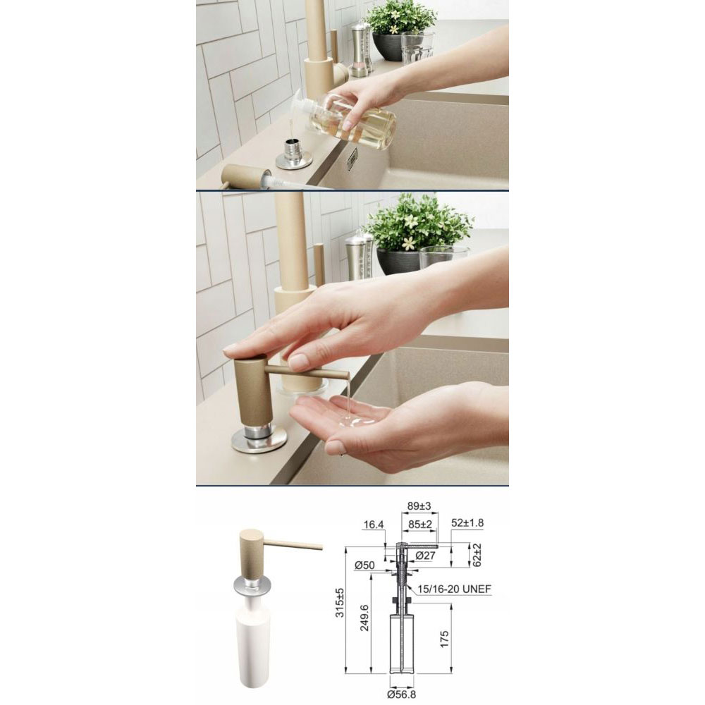● Dozownik okrągły plastikowy do zlewozmywaków - kolor dozownika beżowy. Możliwość zamontowania w zlewozmywaku kuchennym, blacie kuchennym. Otwór montażowy 25-35 mm, rozeta ⌀ 50 mm, całkowita wysokość 31.5 cm. Dozownik można wygodnie napełniać od góry. Pojemność dozownika 350 ml.