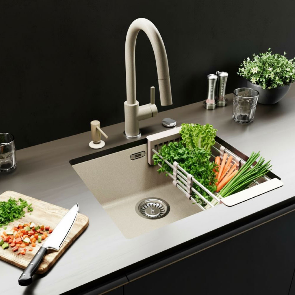 ● Zlewozmywak Franke SID 110‑50 w eleganckim kolorze beżowym to propozycja dla osób, które cenią nowoczesny design, spójną estetykę i komfort codziennej pracy w kuchni. W zestawie z baterią Lina Pull‑Out, dozownikiem Comfort i koszykiem tworzy harmonijny komplet, który porządkuje przestrzeń i sprawia, że kuchnia staje się naprawdę stylowa i przyjemna w codziennym użytkowaniu. Wybierając zlewozmywak z innowacyjnego materiału Tectonite® sięgasz po nowoczesność, funkcjonalność oraz swobodę działania w kuchni.Zlewozmywaki Tectonite® to nowa generacja zlewozmywaków odpornych na wysokie temperatury, uderzenia, zadrapania i powstawanie plam. Materiał Tectonite® jest higieniczny, lekki, delikatny w dotyku i ekologiczny.