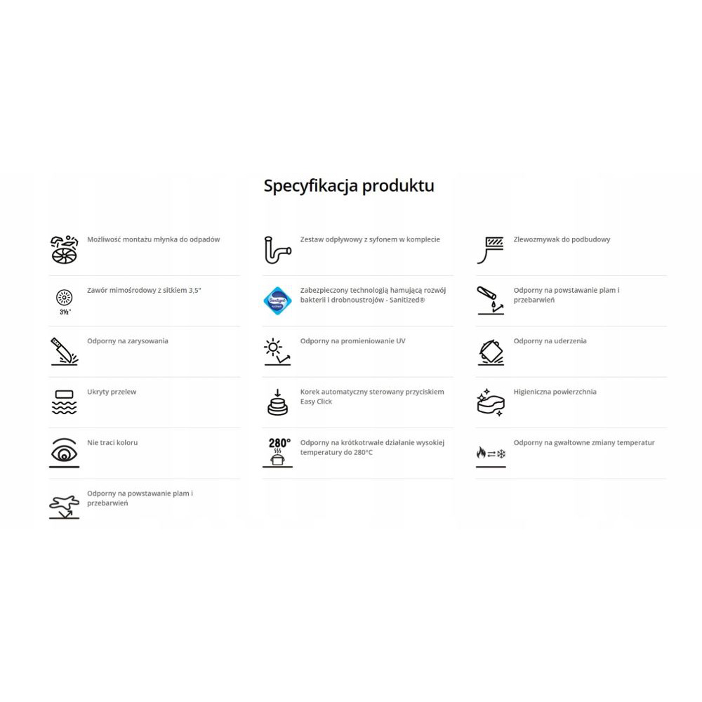 Mały promień zaokrąglenia komory (10 mm) sprawia, że zlewozmywak wygląda nowocześnie i łatwo jest go utrzymać w czystości. Duża pojemność komory ułatwia mycie naczyń i innych dużych przedmiotów, takich jak blachy do pieczenia.