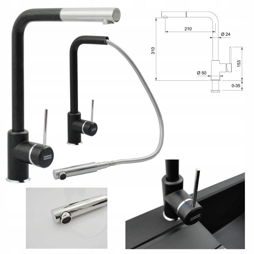 ● Franke Sirius Side bateria kuchenna stojąca z wyciąganą wylewką. Do zastosowania w kuchni. Wyciągana wylewka umożliwia wygodne kierowanie strumienia wody w każdy możliwy zakątek zlewozmywaka, a także pozwala na napełnienie naczyń wodą bez konieczności wkładania ich bezpośrednio do komory zlewozmywaka. Wyciągana wylewka w znacznym stopniu ułatwia również zmywanie naczyń, płukanie warzyw i owoców. Wykończenie baterii: fragranit.
