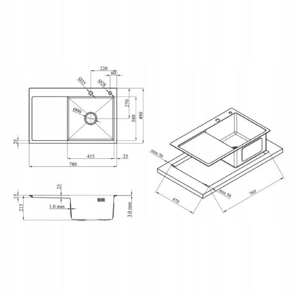 W zestawie: zlewozmywak jednokomorowy z lewym ociekaczem, syfon manualny przyścienny + sitko, dozownik w kolorze pasującym do zlewu, oryginalne pudełko zabezpieczające oraz praktyczne mocowania do blatu, które umożliwiają szybki, wygodny i bezproblemowy montaż.