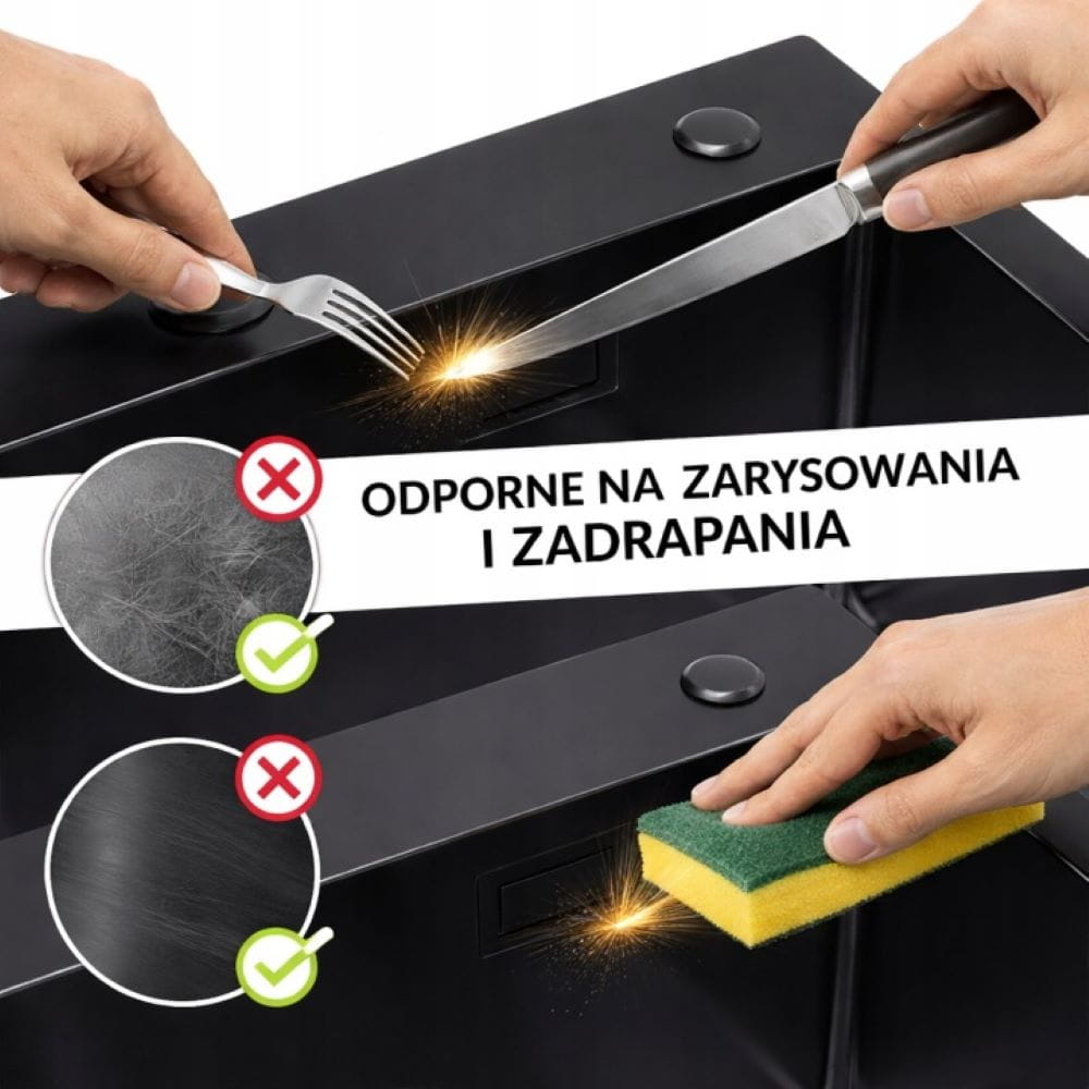Nowoczesny zlewozmywak w eleganckim grafitowym kolorze to idealne rozwiązanie dla osób, które cenią luksusowy wygląd, wysoką jakość wykonania oraz maksymalną funkcjonalność w codziennym użytkowaniu. Dzięki zastosowaniu stali nierdzewnej oraz powłoki PVD, zlewozmywak wyróżnia się nie tylko wyjątkową estetyką, ale także wysoką odpornością na zarysowania, temperaturę oraz korozję. Grafitowe wykończenie nadaje kuchni elegancji i ekskluzywnego charakteru, doskonale komponując się z nowoczesnymi blatami, czarną armaturą czy minimalistycznymi meblami kuchennymi.