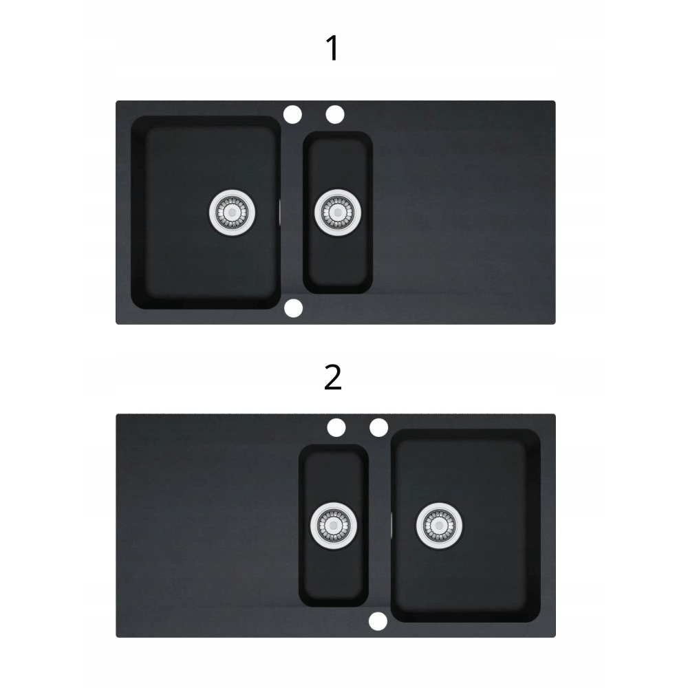 *3 otwory są wywiercone w tej konfiguracji pod baterię, dozownik i pokrętło dla syfonu (korka) automatycznego. Stojąc przodem do zlewozmywaka wybierz stronę większej komory do mycia: 1. większa komora do mycia po lewej stronie, 2. większa komora do mycia po prawej stronie.