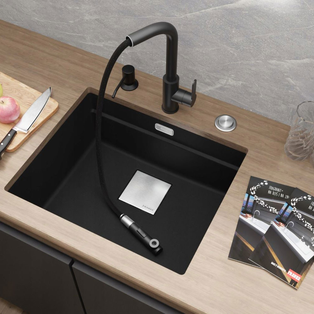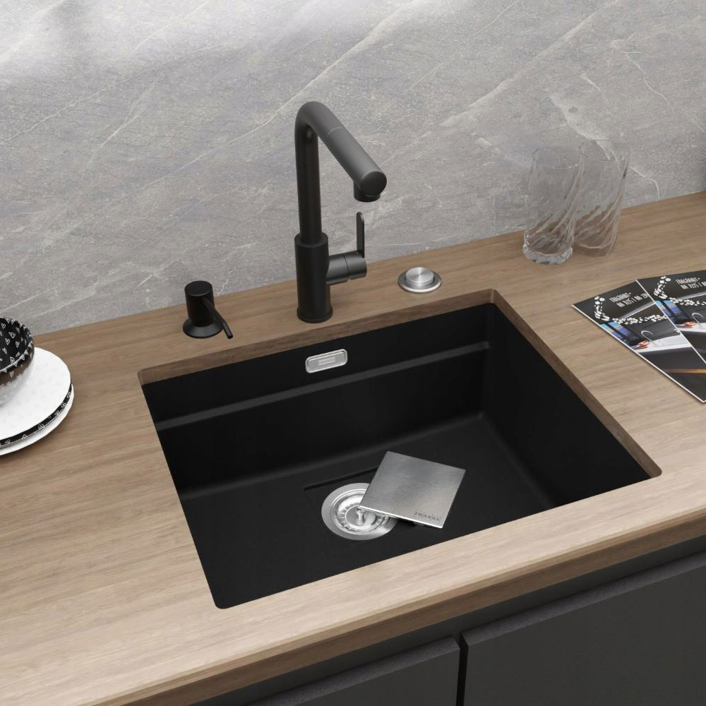 ● Zlewozmywak Franke Kanon KNG 110-52 w kolorze Onyx (czarny nakrapiany) lub czarny mat. Materiał wyprodukowany jest w 80% z prawdziwego granitu, którego głównym składnikiem jest kwarc – jeden z najtwardszych materiałów występujących w przyrodzie. Pozostałe 20% stanowi spoiwo akrylowe, charakteryzujące się wyjątkową wytrzymałością i odpornością. Jego powierzchnia jest idealnie gładka i delikatna w dotyku. Prezentowany zestaw to kumulacja innowacji w najlepszym tego słowa znaczeniu. Zainwestuj raz a dobrze z Franke i ciesz się przez lata produktami tej marki. Perfekcja wykonania w połączeniu z praktycznym wykorzystaniem jest kluczem do sukcesu w każdej kuchnii.