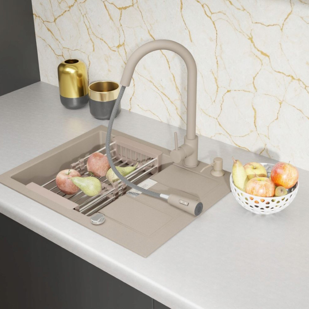 ● Nowoczesna bateria kuchenna to idealne połączenie funkcjonalności i designerskiego wyglądu. Elastyczna, wyciągana wylewka zapewnia maksymalną wygodę podczas codziennych prac kuchennych – od napełniania garnków po dokładne płukanie zlewu.