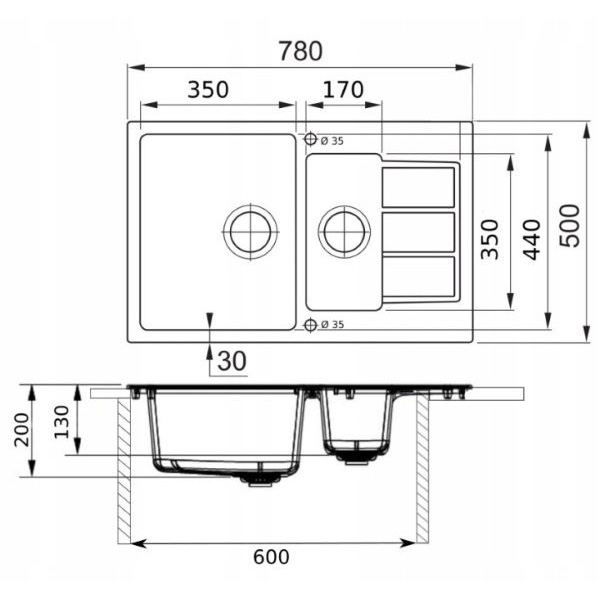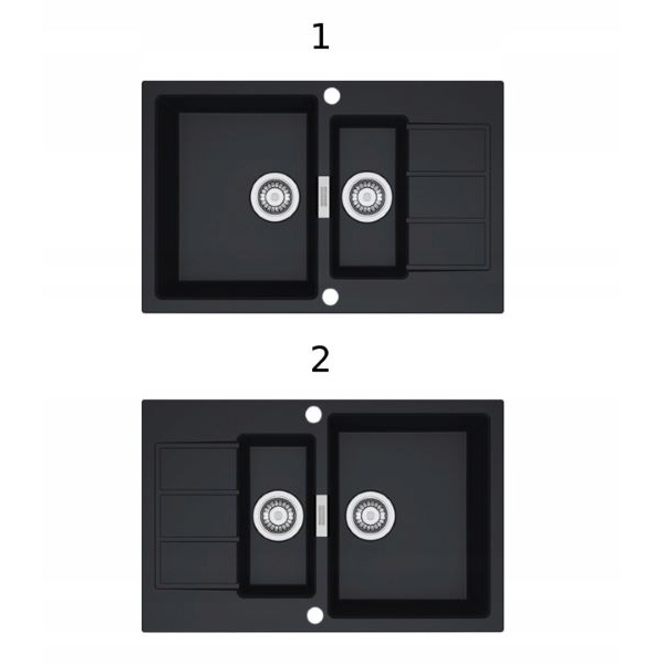 Zlewozmywak posiada 2 otwory wykonane fabrycznie Ø35 mm (pod baterię, pokrętło korka automatycznego, inne). Zlewozmywak jest odwracalny: