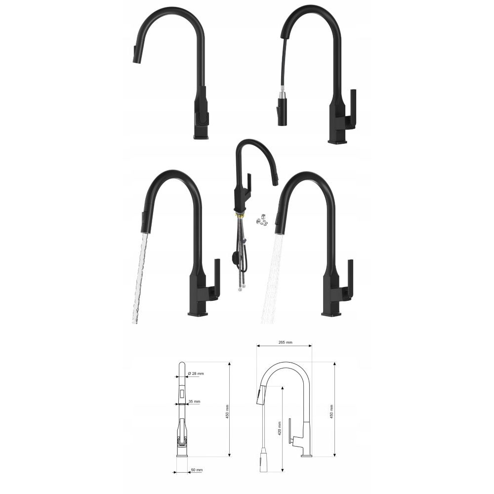● Paso to nowoczesny model baterii wyposażony w wyciąganą wylewkę i dwufunkcyjną słuchawkę, co znacząco ułatwia oraz podnosi komfort pracy w kuchni. Dzięki długiej i ruchomej wylewce możliwe jest sprawnie mycie dużych naczyń oraz precyzyjne kierowanie strumienia wody w każdy zakamarek zlewozmywaka. Dodatkowo, kran wyposażony jest w dwufunkcyjną słuchawkę, która może emitować standardowy strumień lub delikatny, prysznicowy deszcz, w zależności od potrzeb. Model wykonany został z trwałego i odpornego mosiądzu, a elegancka barwa w czarnym matowym wykończeniu doskonale wpisuje się w aktualne trendy oraz harmonizuje z różnymi aranżacjami kuchennymi. W zestawie komplet elementów potrzebnych do montażu.