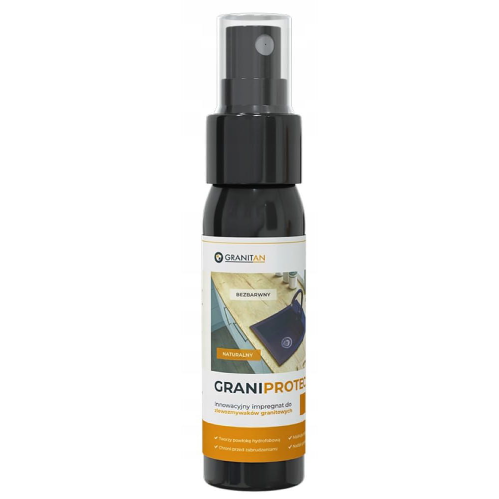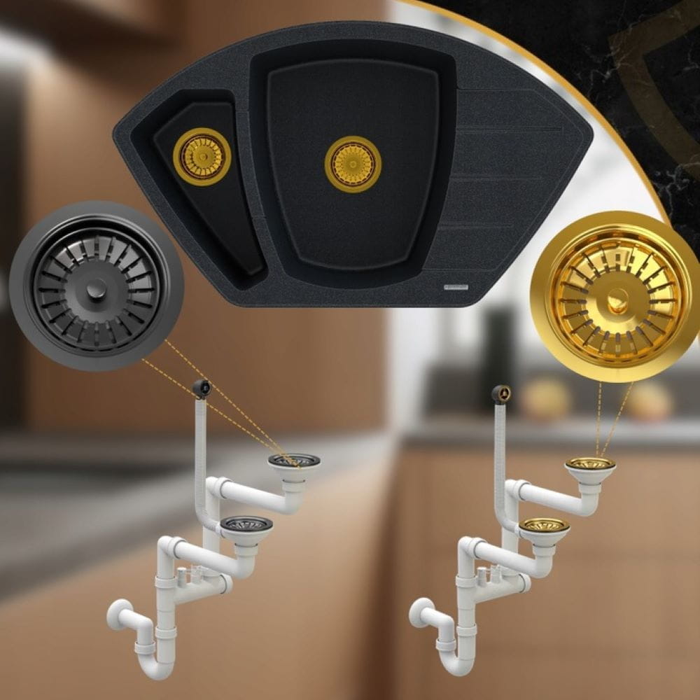 Zestaw zawiera: zlewozmywak granitowy dwukomorowy, przyścienny syfon manualny w kolorze czarnym lub złotym (do wyboru) oraz impregnat GraniProtect.
