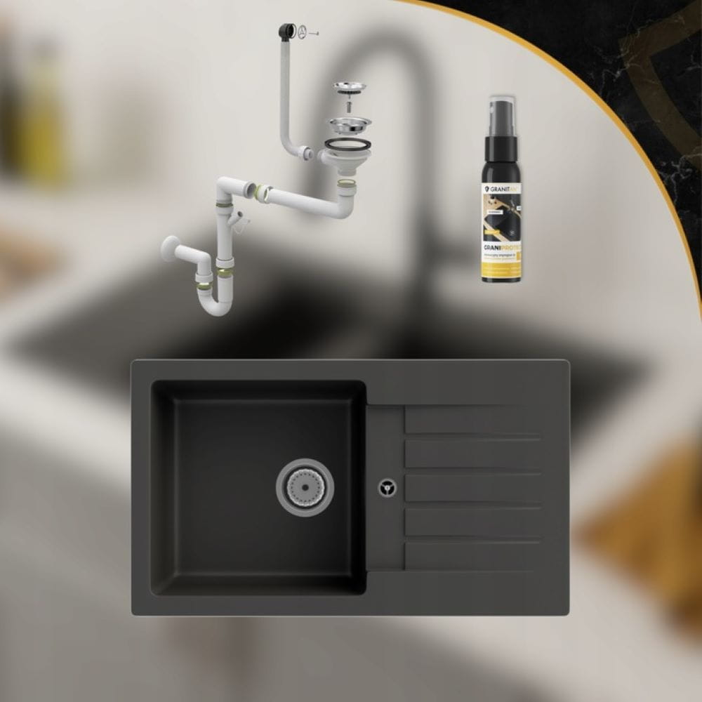 W zestawie otrzymujesz: zlew granitowy Trix (możliwość wyboru koloru, jednokomorowy z ociekaczem), przyścienny syfon manualny (chrom, z możliwością podłączenia zmywarki lub pralki) oraz profesjonalny impregnat GraniProtect – GRATIS.