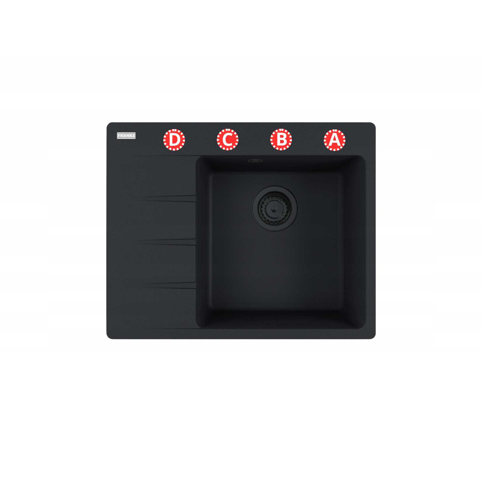 Miejsca, w których mogą być wykonane otwory zaznaczono na zdjęciu w czerwonych kółkach z przerywaną zewnętrzną linią i oznaczeniami A,B,C,D. Otwory są podfrezowane. Możliwe jest przewiercenie do 4 otworów Ø 35 w tym zlewozmywaku.